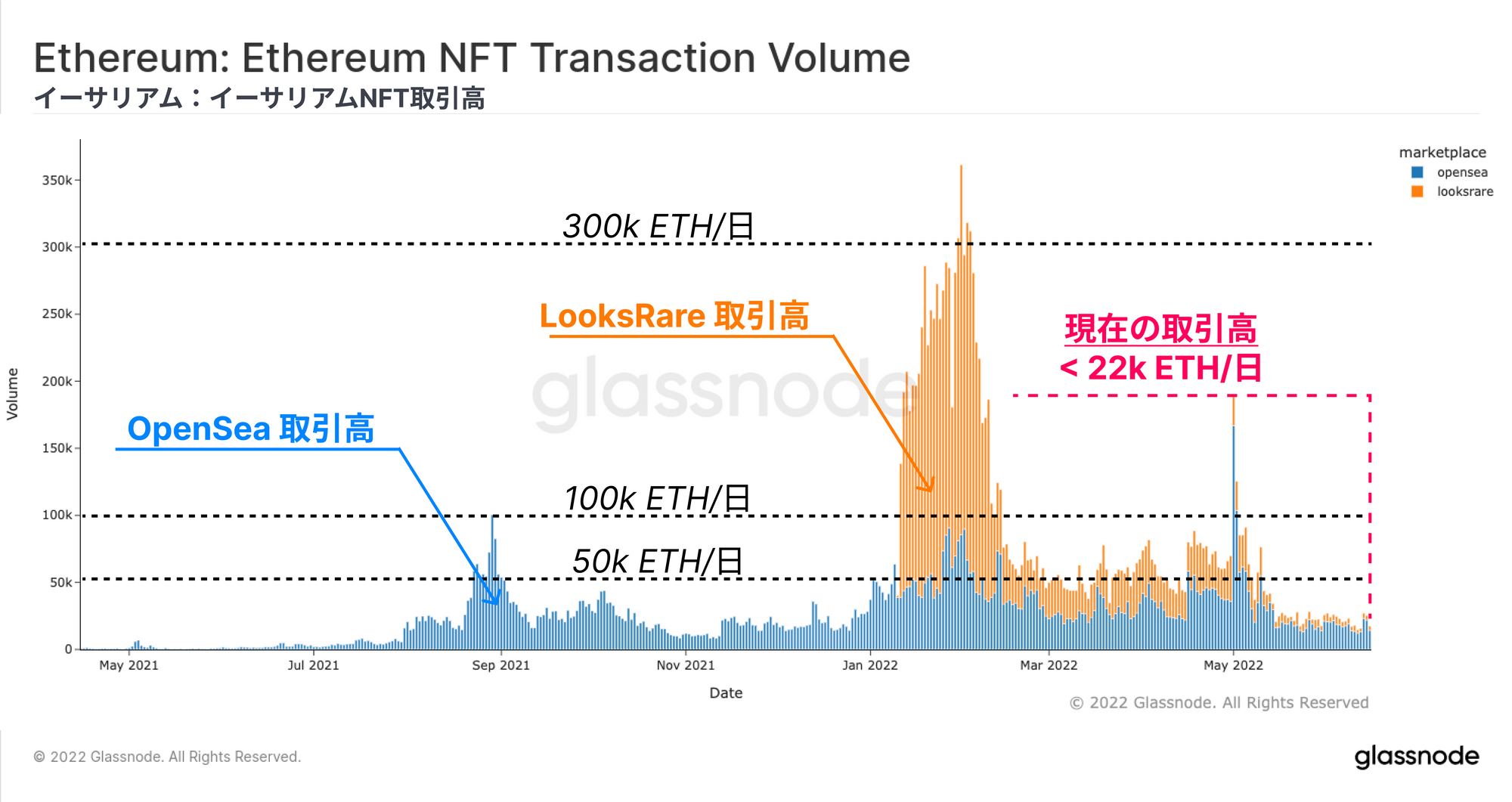 NFTの取引量に関しても、同様の観察が可能である。下図はOpenSea(青色)とLooksRare(オレンジ色)のETH建て取引量を示しており、2022年の大半は1日あたり50k ETH~100k ETHの取引量を維持していた。しかし、今年5月以降は取引量が急激に減少し、現在は22k ETH/日(約2,420万ドル/日@$1,100ETH)強に保たれている。
