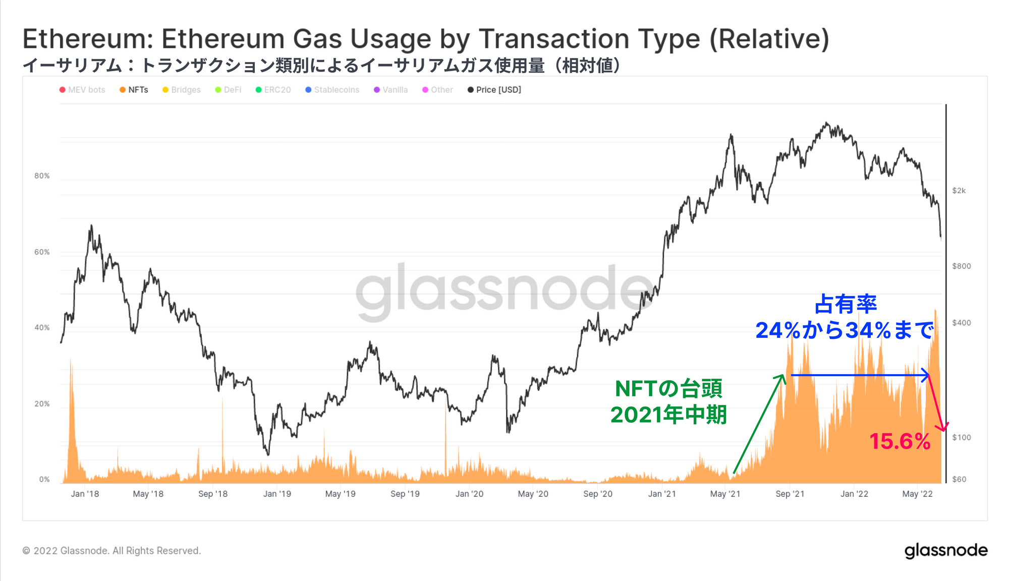 NFTセクター全体では、NFT取引に使われるガスの相対的な割合は2021年後半にピークを迎えたものの、2022年6月上旬につけた最高値46.0%から減少し、現在は19.6%に留まっている。2021年から22年にかけては、NFT取引が活況を呈し、ガス使用量全体において20%以上を維持した。