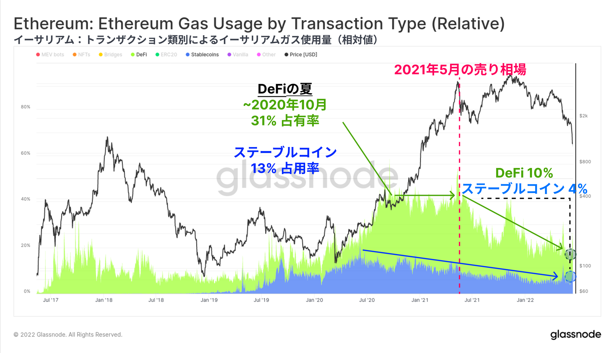 下図は、ステーブルコイン(青色)とDeFiアプリケーション(緑色)のガス使用量による優位性を示している。ステーブルコインの送金、およびDeFiプロトコルは現在のイーサリアムのガス使用量のそれぞれ5.2%、10.2%を占めている。この仕様にあたる占有率は、2021年5月の市場最高値でステーブルコインが11.4%、DeFiが33.4%のガス利用を占めて以来、着実に減少している。