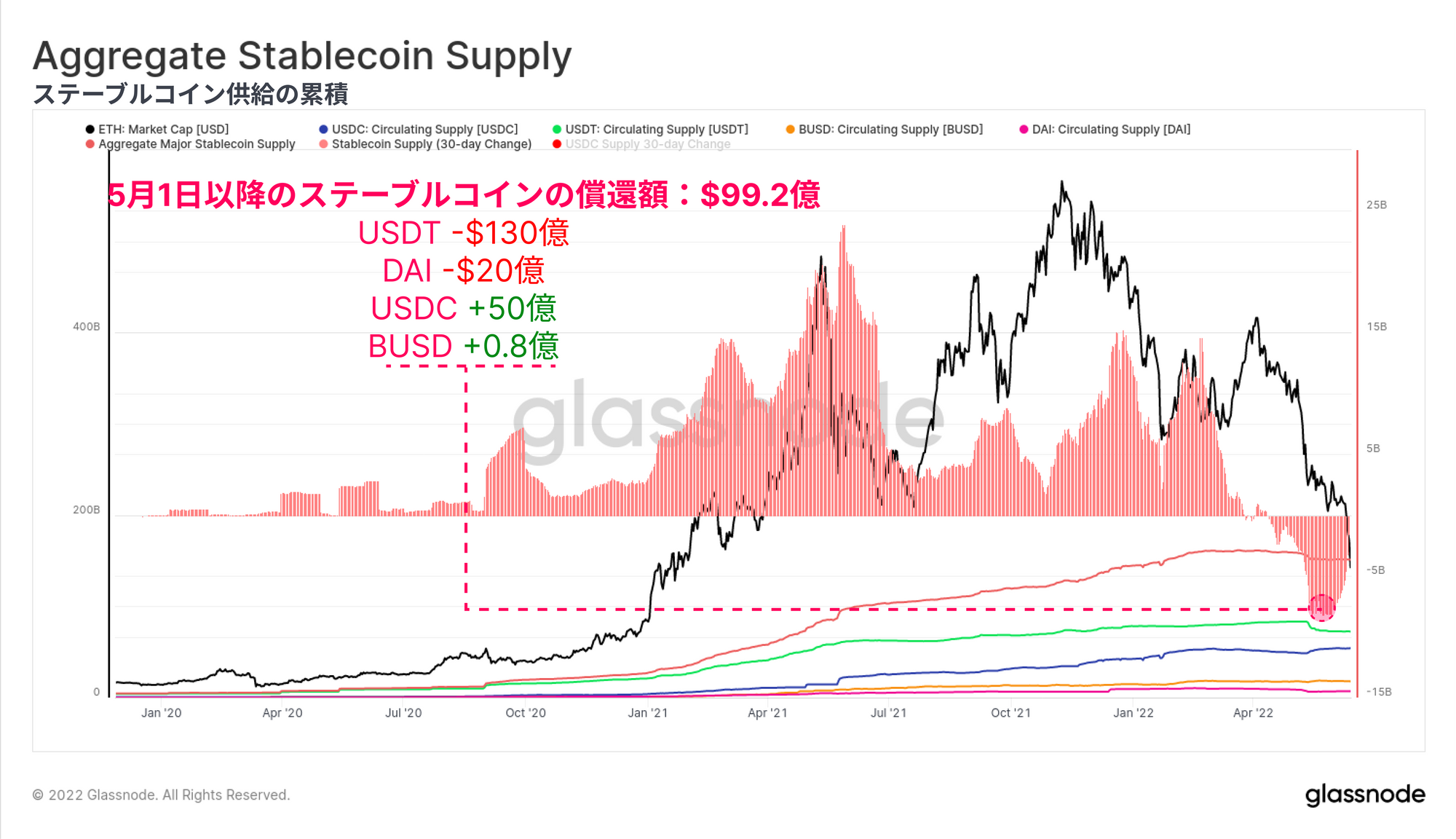 5月に入ってから、ステーブルコインの償還(USD出金)は合計で99.2億ドルに達し、市場から資金が流出している。USDTが-130億ドルと最も多く、次いでDAIが-20億ドルとなっており、投資家がMakerDAOの金庫経由で得たレバレッジを自主的に解消し(または強制ロスカットされ)ているためである。