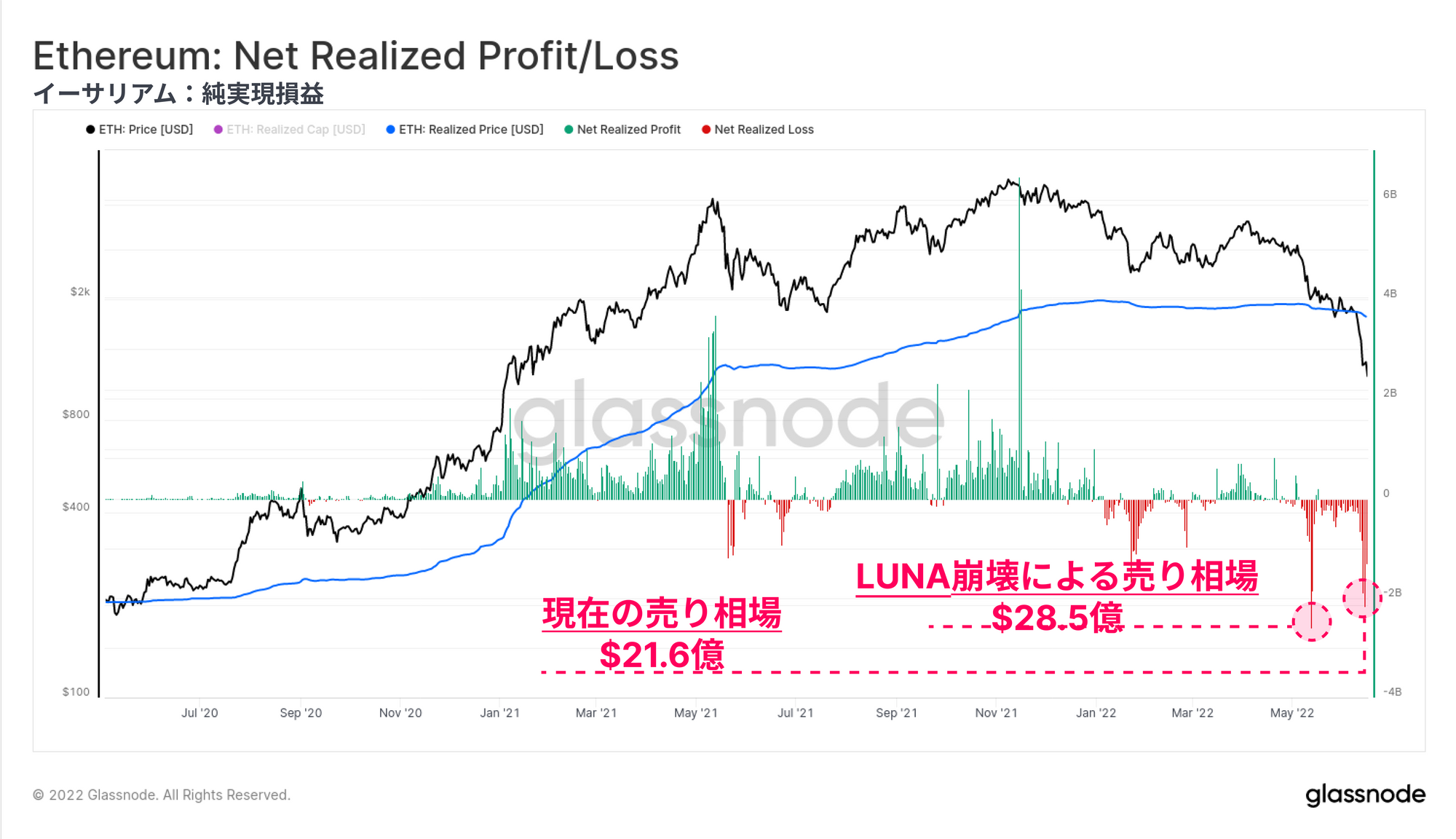 5月上旬のLUNAをきっかけとした売り相場は、1日で28.5億ドルの資金流出となり、イーサリアム投資家の純実現損失における過去最高を記録している。現在のデレバレッジはこれに次ぐもので、6月14日に21億6000万ドルの損失を計上している。