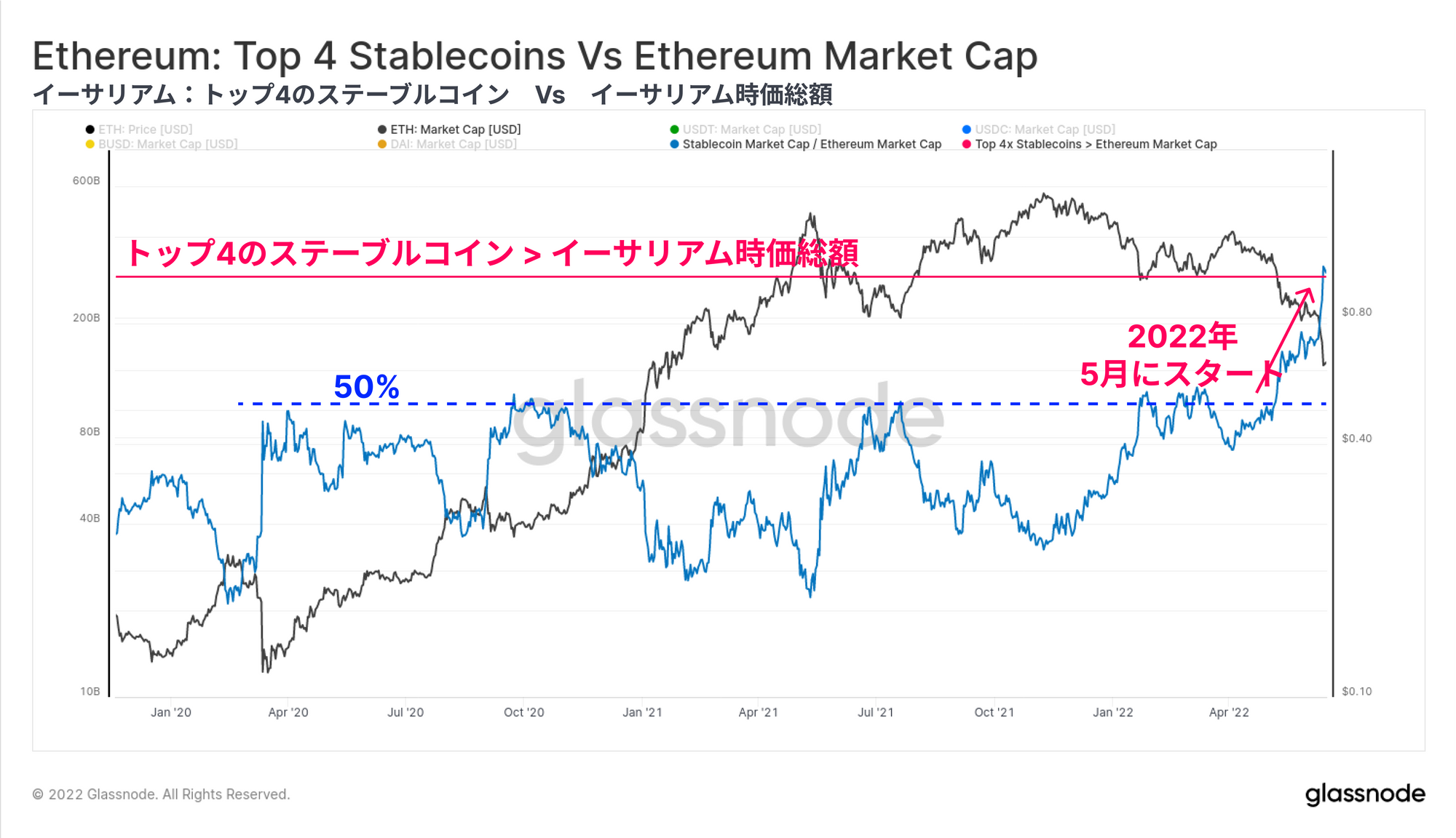 上位4つのステーブルコイン(USDT、USDC、BUSDとDAI)の時価総額は、現在イーサリアムの時価総額を30億ドル上回っている。トップ4のステーブルコインの時価総額の合計は、これまで2020年から22年にかけて何度もイーサリアムの時価総額の50%を超えていたが、今年5月と6月に劇的な急上昇を記録している。