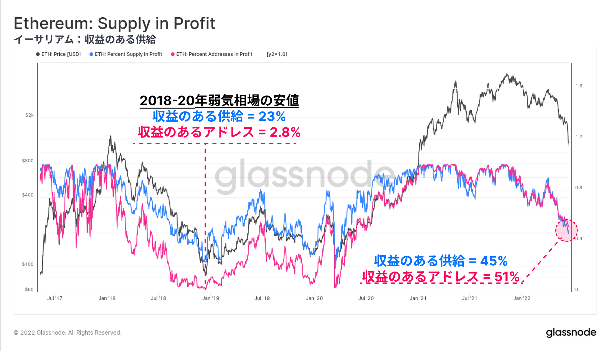 収益のある供給量(青色)とアドレス数(ピンク色)の割合(Supply in Profit)は、過去のサイクルに対する現在のイーサリアム市場の経済的な痛みを測定するための2つのハイレベルなオンチェーン指標である。現在、ネットワークの収益性は市場がコロナクラッシュから回復する最中である2020年6月以来の低水準に達している。