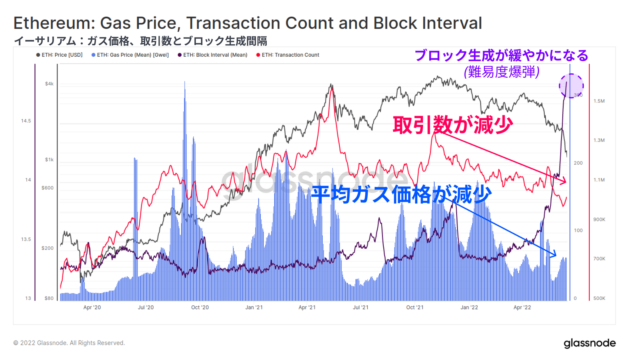 平均ガス価格はここ数週間でわずかに回復しているが、これは来たるMergeアップデート(イーサリアムがPOWからPOSにアップデート)のために難易度爆弾がセットされ、ブロック生成の間隔(紫色)が遅くなったことによる混雑の結果である可能性が高い。