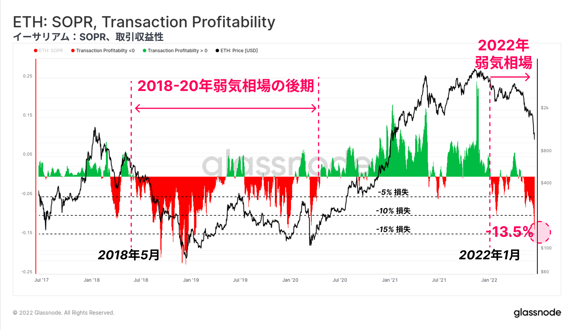 現在の取引収益性は、ETHの取引が平均で-13.5%の損失を確定していることを示している。これは、過去のイーサリアムの弱気相場と一致する規模であり、2018年の弱気サイクルの安値で実現した-20%から-22%の損失と比較すると低い水準にとどまっている。