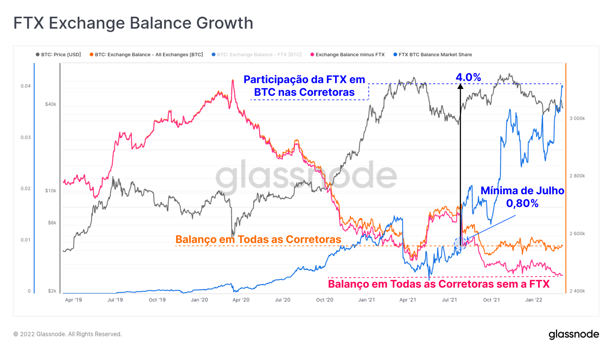Atualmente, o volume total de BTC detido pela FTX é estimado em 103,2 mil BTC, o que representa um crescimento extraordinário em relação aos meros 3 mil BTC mantidos em março de 2020. Isso representa um aumento de dominância de saldo de 0,8% em julho de 2021 para 4,0% hoje.