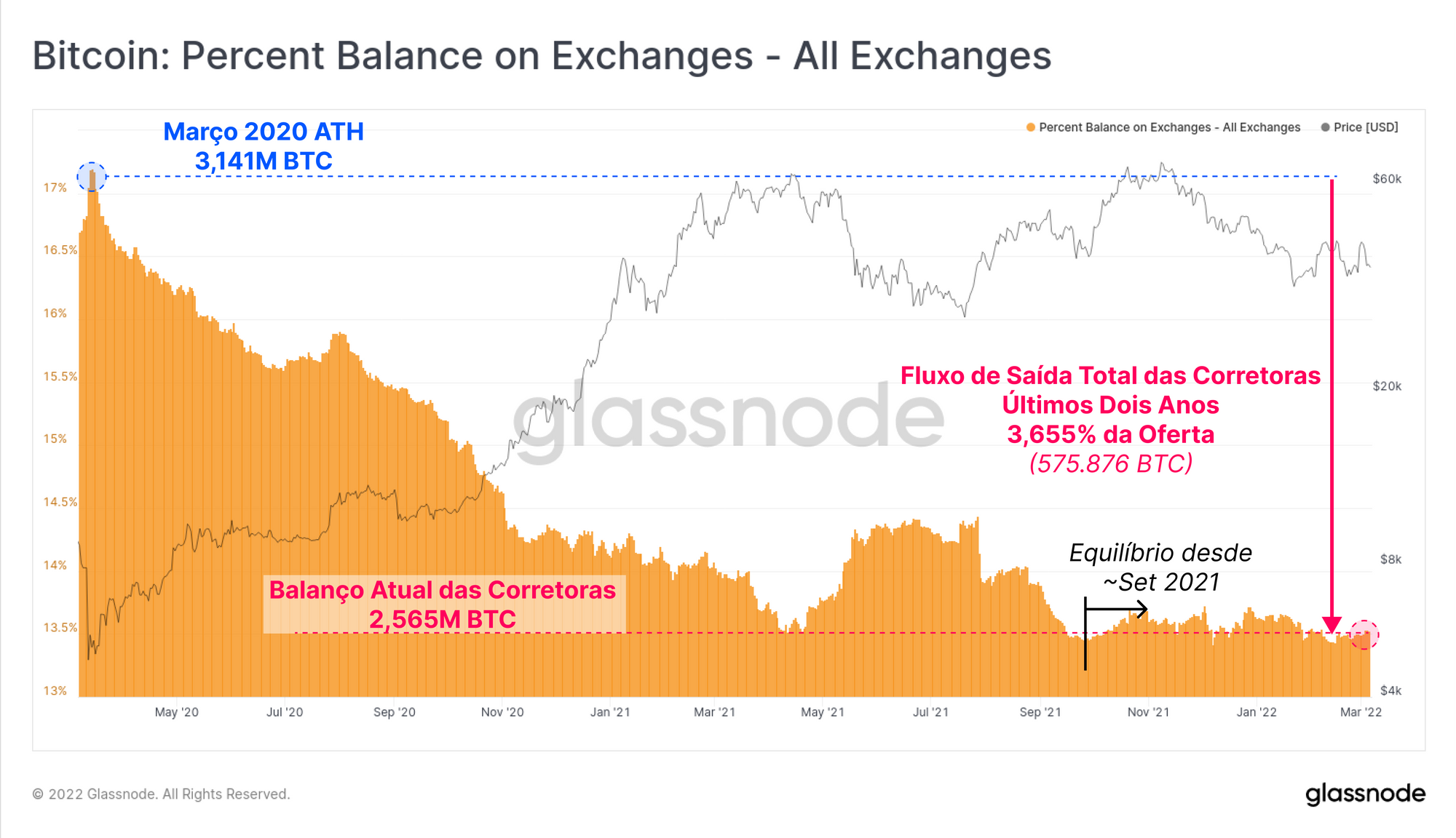Observe que 3 de 4 das características acima têm uma inclinação para as entradas das corretoras. Isso é em parte o que torna a saída agregada de 575.876 BTC das corretoras (3,655% da oferta) desde a liquidação de março de 2020 tão impressionante. Observe também como um equilíbrio relativo foi estabelecido desde setembro de 2021.