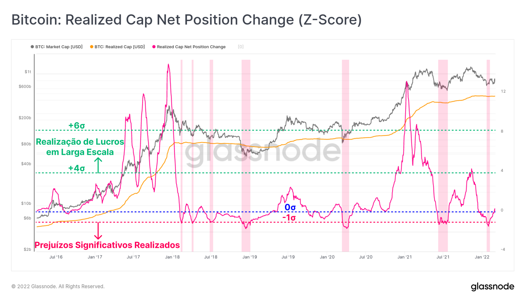 Para fechar, olhamos para a mudança de 30 dias no"Realized Cap". Essa métrica indica a magnitude total do lucro/prejuízo em toda a rede, mapeado como um desvio estatístico da média de longo prazo (Z-Score).