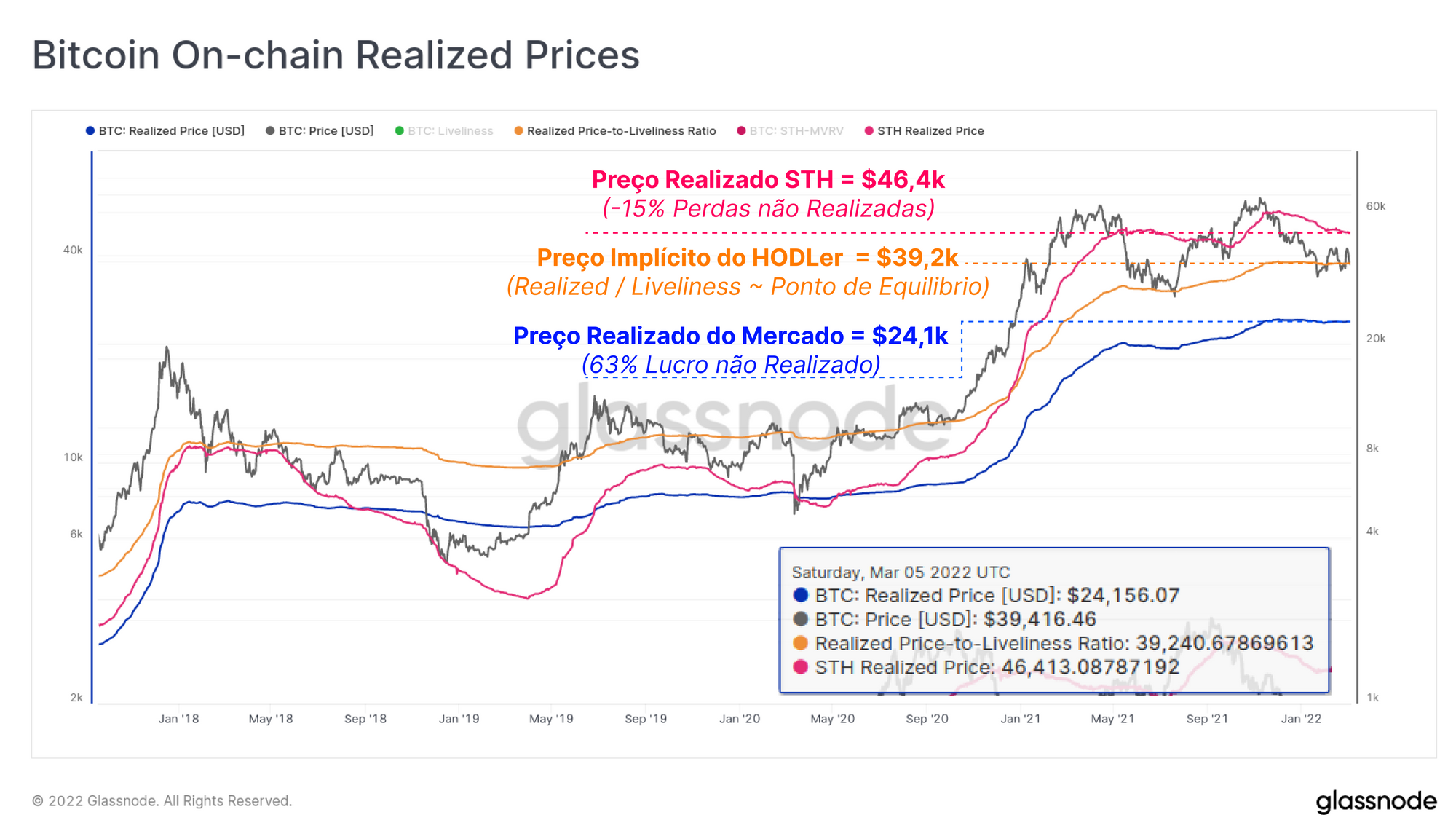 - O Preço Realizado do Investidor de Curto Prazo está sendo negociado atualmente a US$ 46,4 mil e, portanto, mantém uma perda agregada não realizada de 15%. Essa métrica é um reflexo de todas as moedas que foram movidas nos últimos 155 dias.