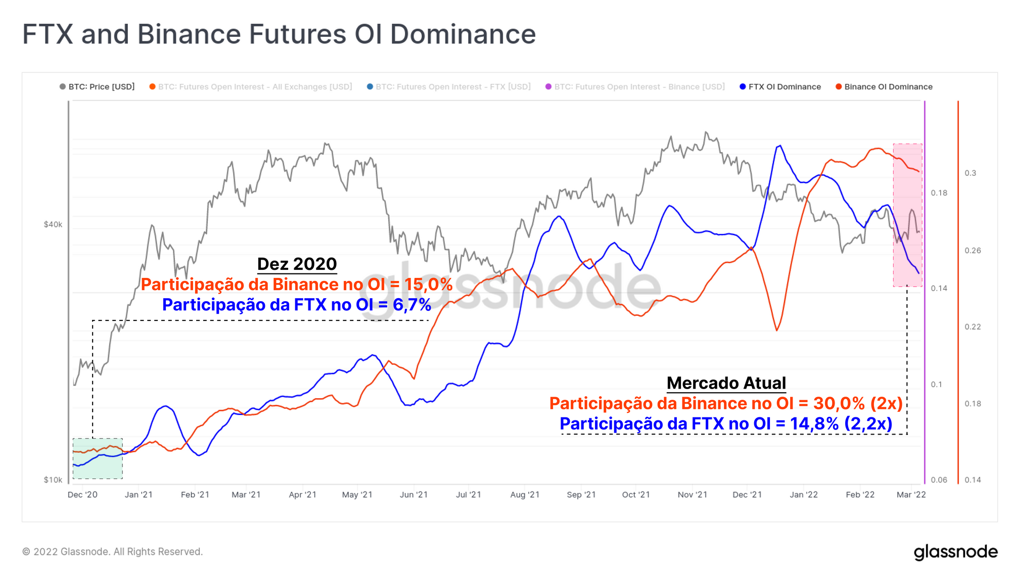 Juntamente com o crescimento do Balanço em BTC, tanto a Binance quanto a FTX viram sua participação sobre os mercados de futuros mais que dobrar desde dezembro de 2020. A participação da Binance no "Future OI" aumentou de 15% para 30%, enquanto o FTX aumentou de 6,7% para mais de 14,8% (um aumento de 2,2x).