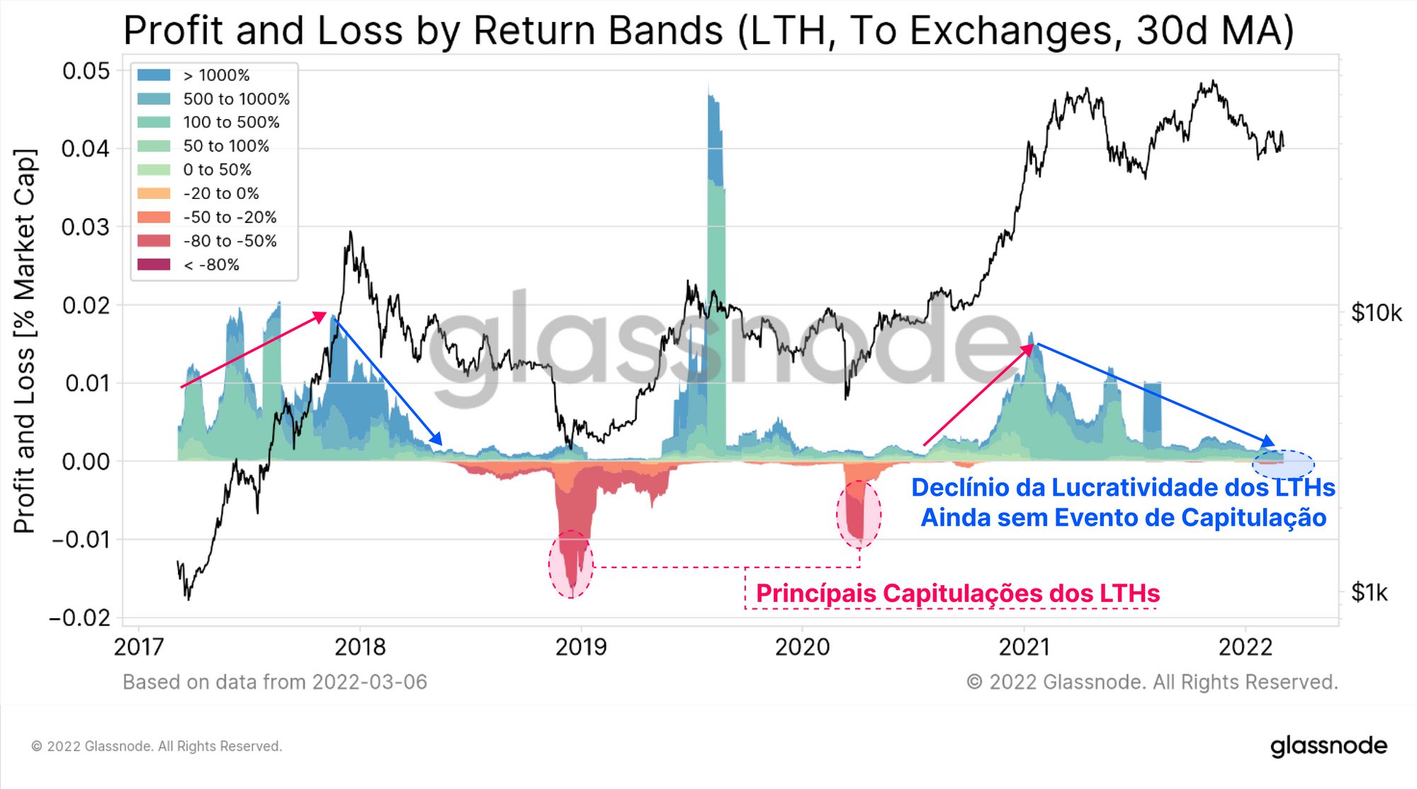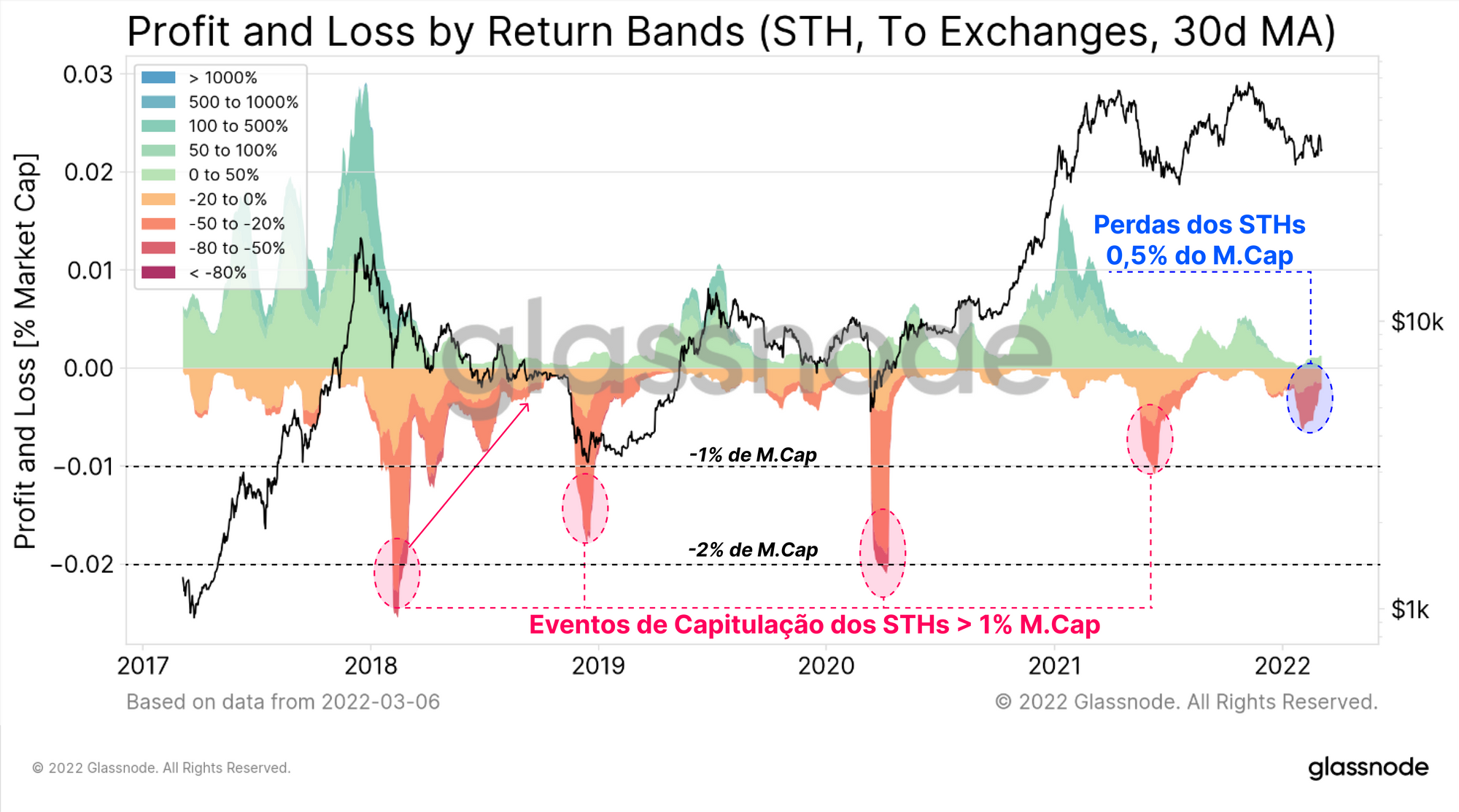 A magnitude historicamente baixa das perdas dos STH e LTH pode estar sinalizando com mais probabilidade a exaustão agregada do vendedor. No entanto, o risco de uma capitulação final e completa de STHs e LTHs deve permanecer no radar e tem vários precedentes históricos.