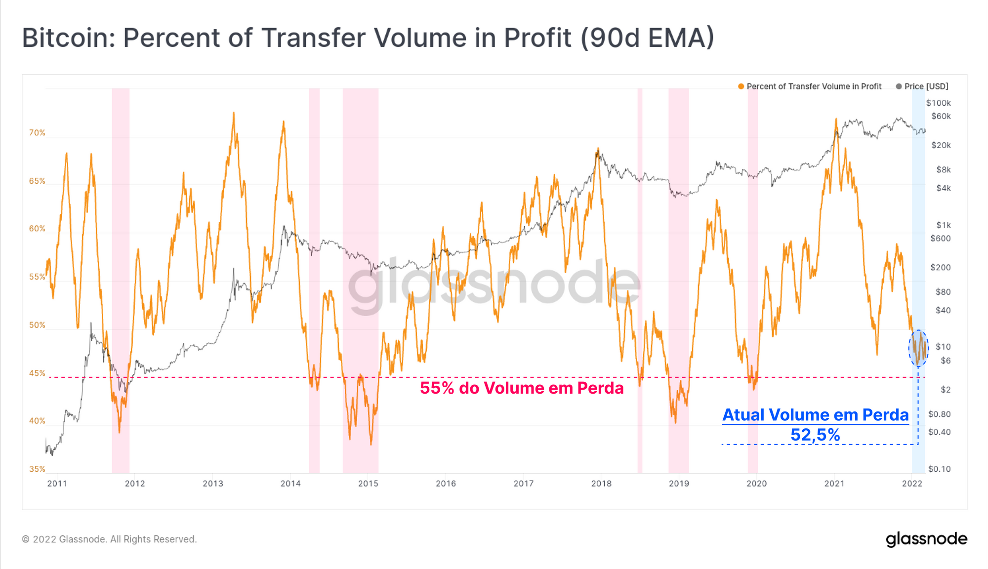 A proporção do volume on-chain que está no lucro também está perto de níveis historicamente baixos, atingindo 47,5% nesta semana. Invertendo essa observação, podemos deduzir que mais da metade (52,5%) de todo o volume de transações atualmente é feito com prejuízo. Para contextualizar, os estágios finais dos ciclos de baixa anteriores (marcados em vermelho) foram pontuados por mais de 55% de todo o volume de transferência em perda (eventos de capitulação).