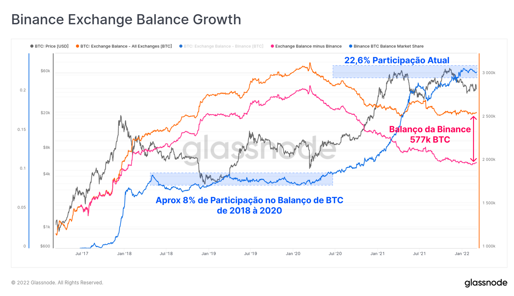 A Binance, no entanto, leva a coroa para o crescimento mais impressionante no domínio da participação de mercado, passando de um domínio relativamente estável de 8% do saldo BTC em 2018-20, para mais de 22,6% hoje. O saldo total mantido na Binance aumentou em 315 mil BTC desde março de 2020, um aumento de 120% em apenas dois anos.