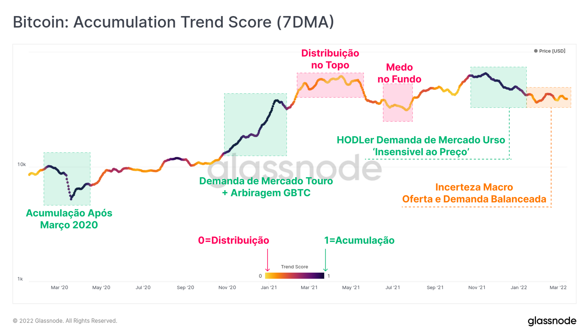 Podemos ver que o período de outubro de 2021 a janeiro de 2022 foi de acumulação muito forte (> 0,9 roxo escuro), provavelmente por HODLers insensíveis ao preço. No entanto, na maior parte de 2022, essa métrica oscilou entre um valor de 0,2 e 0,5. Isso destaca o impacto da incerteza macro global no sentimento dos investidores, com uma acumulação mais fraca ocorrendo como resultado.