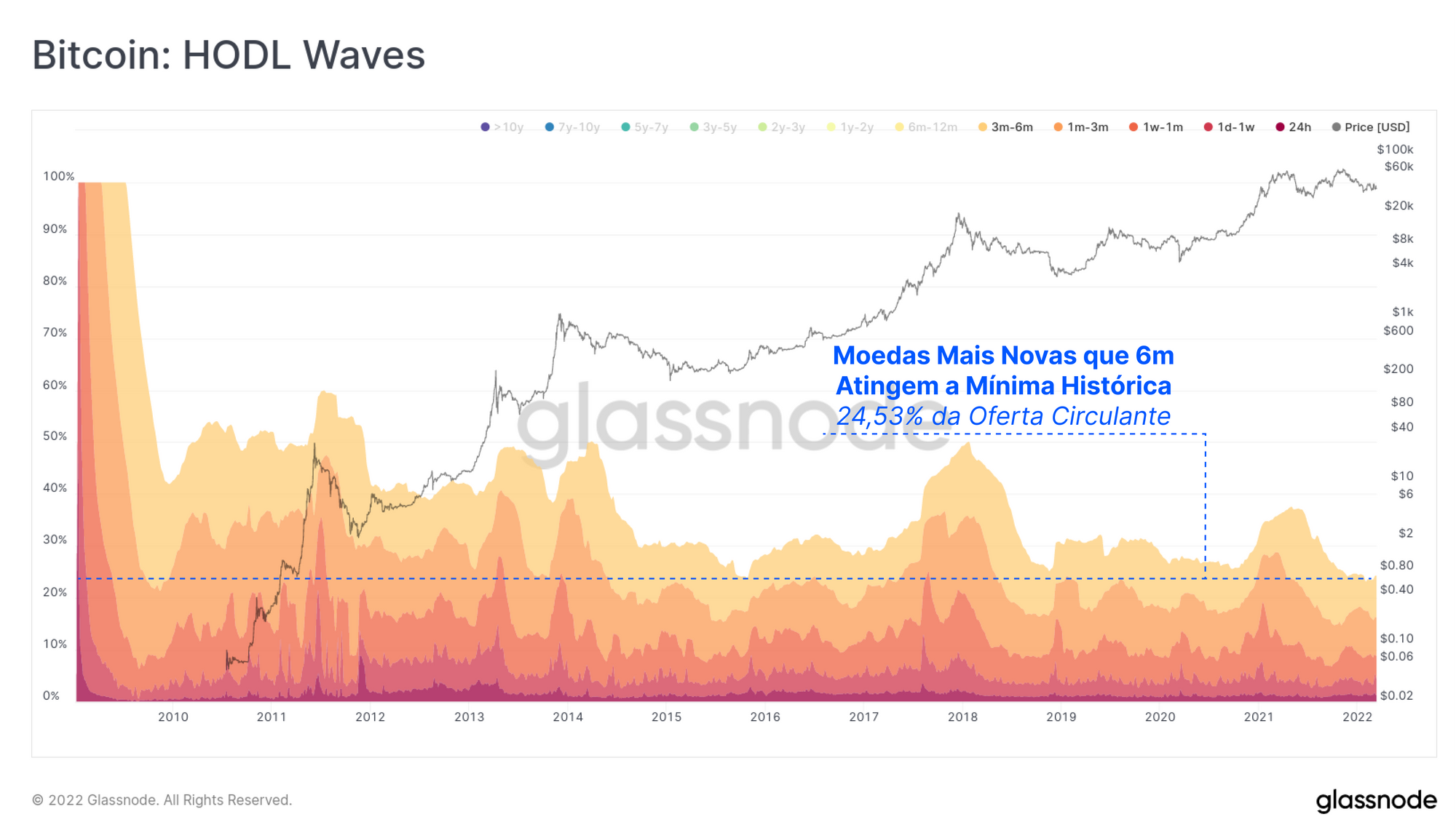 As ondas HODL também estão mostrando que as moedas com menos de 6 meses de idade estão em mínimas históricas. Apenas 24,53% da oferta circulante está neste grupo jovem, o que significa que 75,47% da oferta permaneceu inativa por mais de 6 meses.