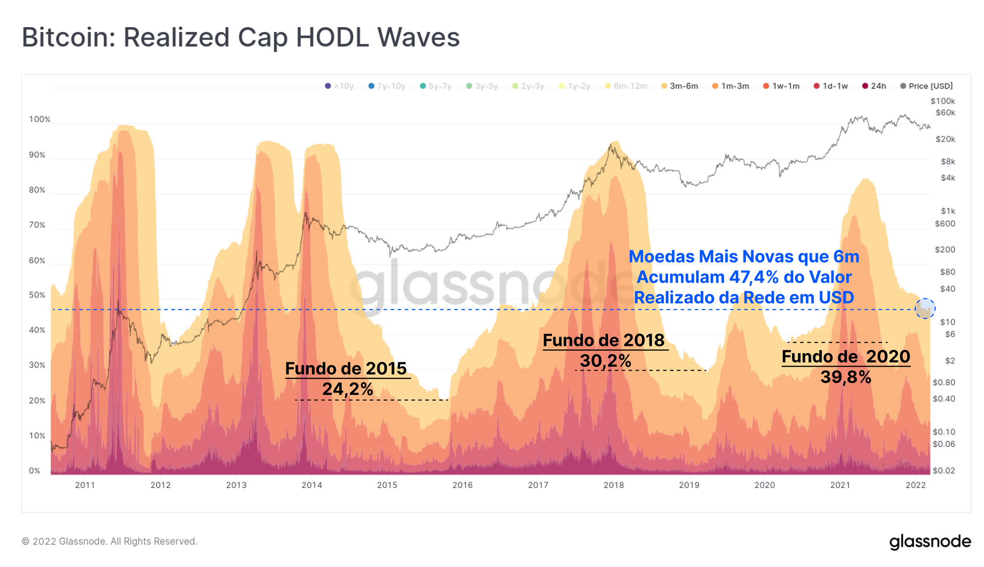 Os mercados urso em estágio avançado são caracterizados de maneira semelhante por proporções mais baixas de capital detido por essas moedas mais jovens, à medida que as moedas amadurecem em carteiras de investidores de longo prazo. A faixa etária 3m-6m em particular (faixa amarela superior no gráfico abaixo) está atualmente aumentando significativamente, indicando que um grande volume da oferta comprada entre setembro e dezembro do ano passado permanece retido.