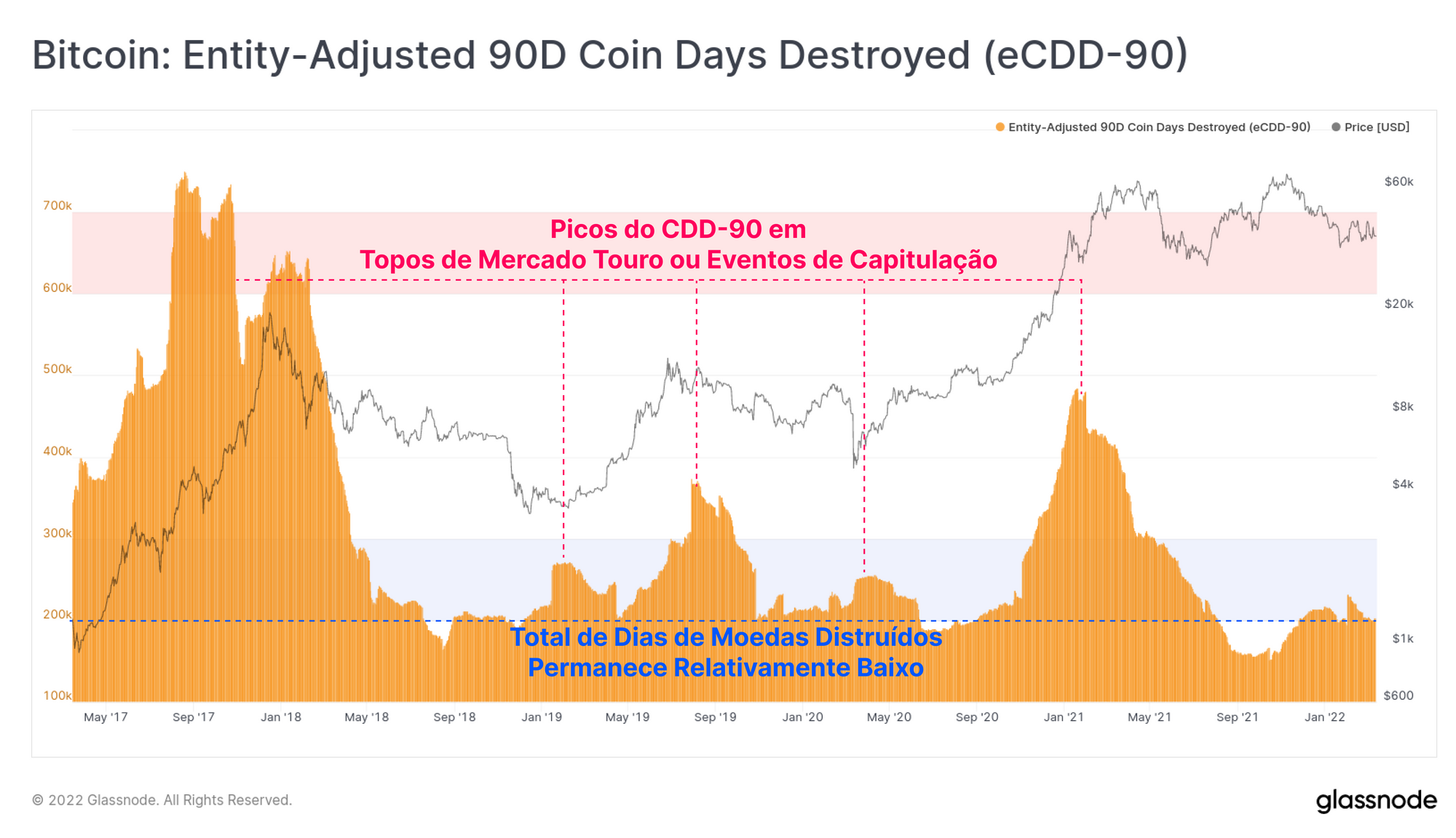 Durante os mercados de baixa, a métrica CDD-90 é negociada em níveis baixos, pois os investidores acumulam moedas lentamente e há uma preferência agregada por HODLing. No entanto, aumentará rapidamente após os eventos de capitulação, pois o medo e o pânico criam uma onda final de pressão do lado da venda, que esgota todos os ursos restantes.