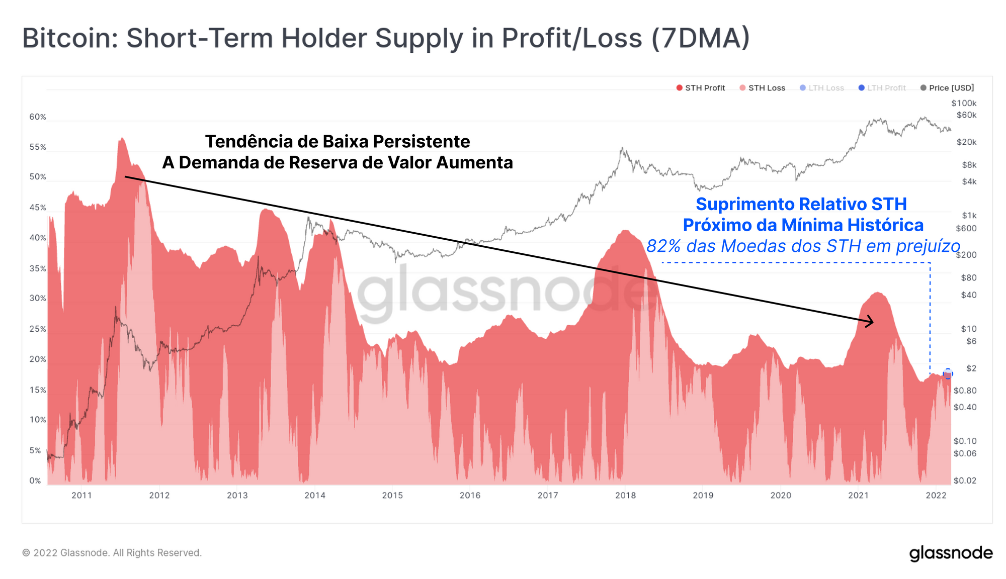 A oferta de STH está atualmente perto de mínimos históricos, o que é construtivo para os preços. No entanto, 82% dessas moedas (2,51 milhões de BTC) estão atualmente com prejuízo e, por sua vez, são a fonte mais provável de pressão do lado da venda.