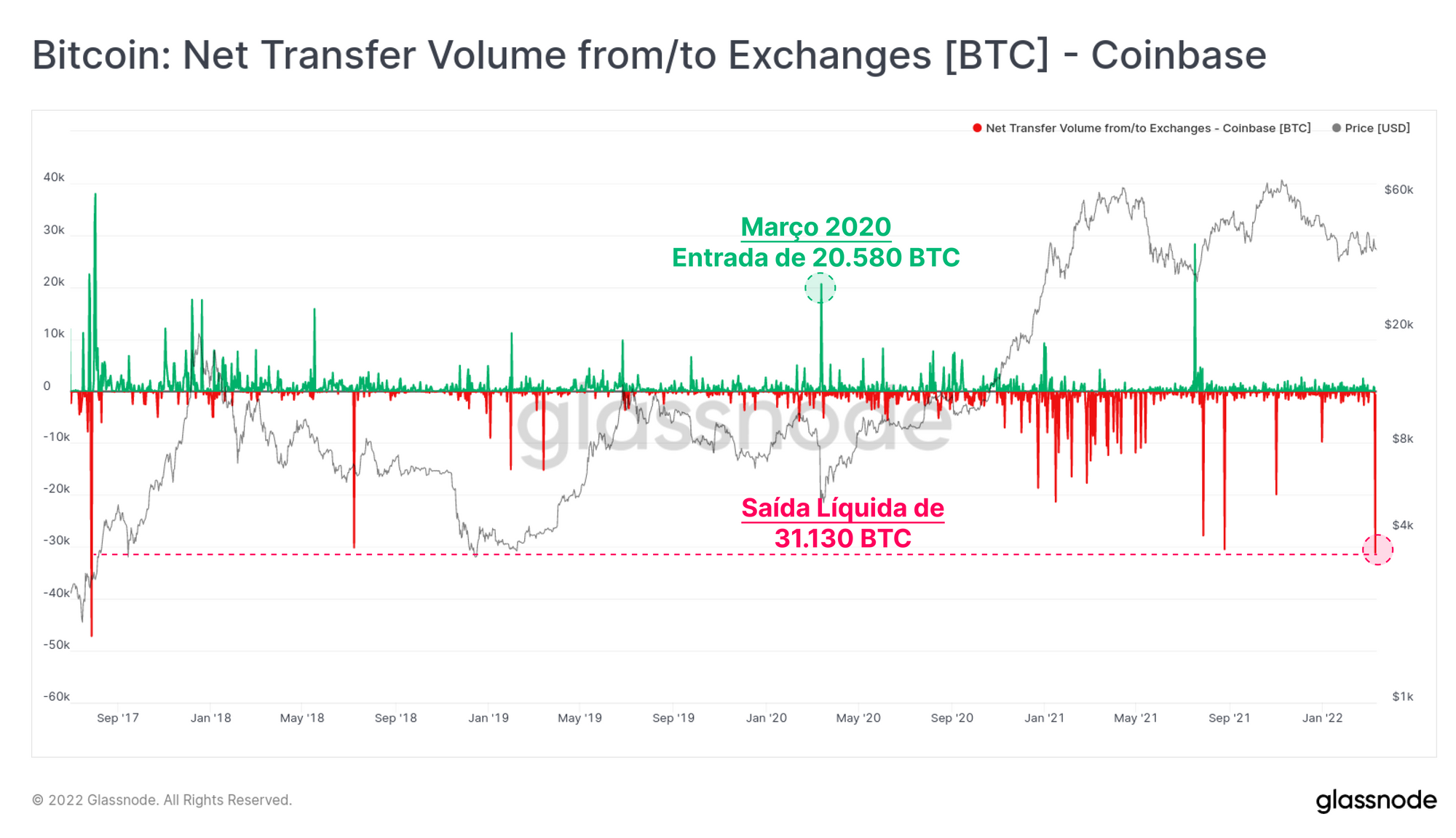 A Coinbase, em particular, viu uma saída líquida muito grande esta semana, totalizando 31.130 BTC (US$ 1,18 bilhão). Esta é a maior saída líquida desde 28 de julho de 2017. O regime de saídas líquidas (barras vermelhas) após março de 2020 também é bastante evidente no gráfico abaixo. Isso continua sendo um forte sinal de que os investidores estão cada vez mais vendo o Bitcoin como um ativo relevante em portfólios modernos.
