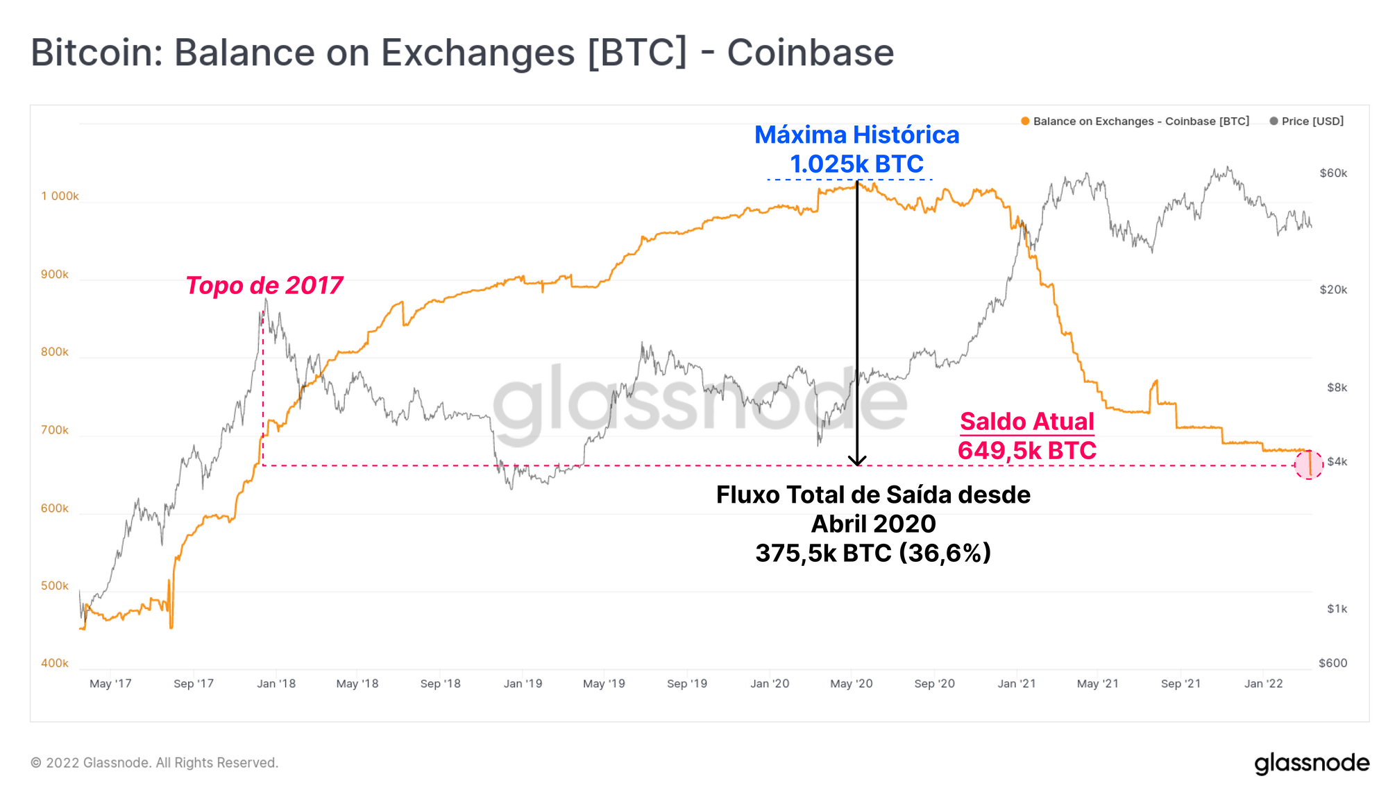 Essa saída reduziu o saldo total mantido na Coinbase para 649,5 mil BTC, trazendo-o de volta aos níveis vistos pela última vez no topo do mercado em alta de 2017. O saldo total de Bitcoin mantido pela Coinbase agora diminuiu 375,5 mil BTC (36,6%) em relação ao ATH alcançado em abril de 2020.