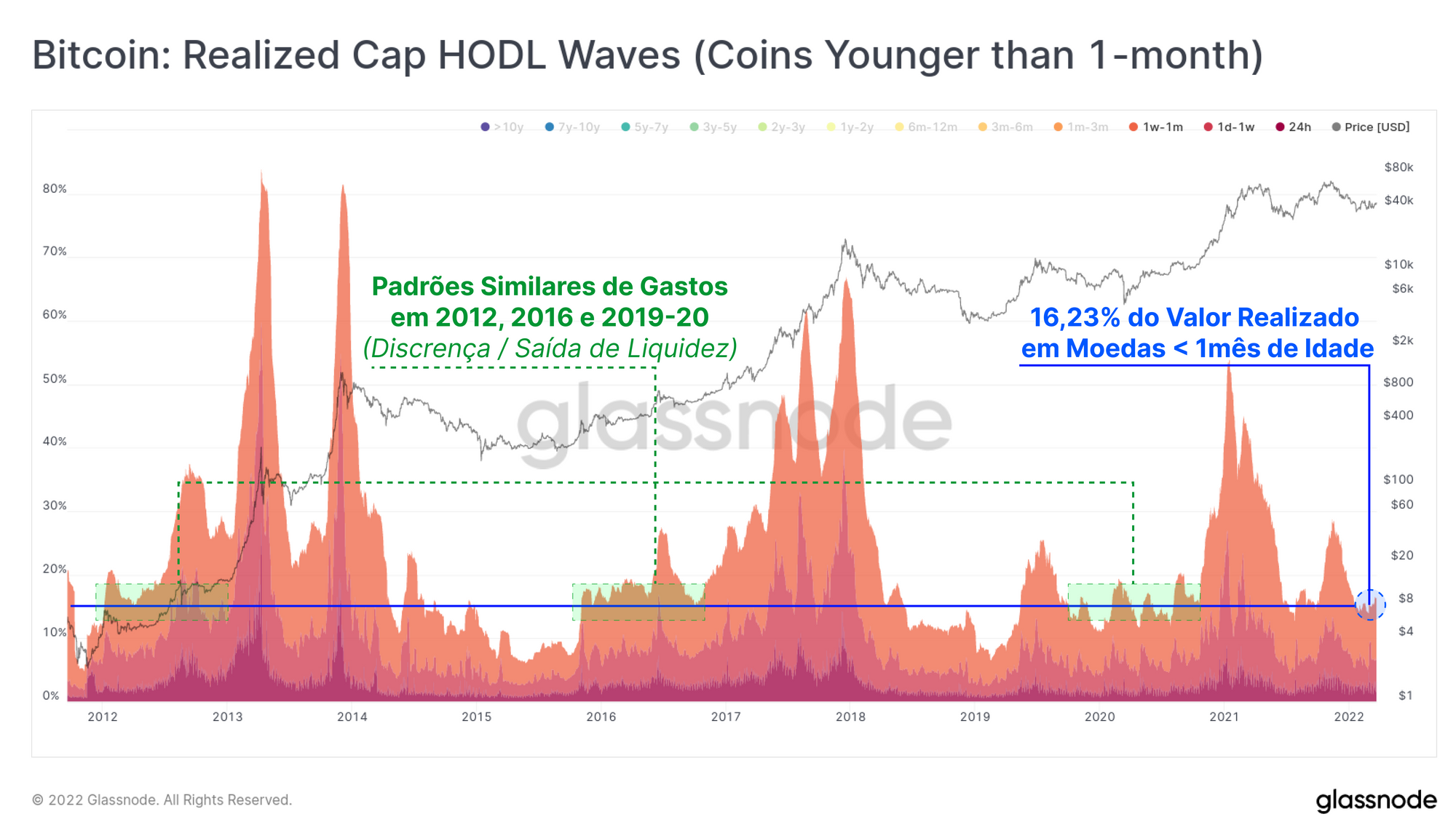 Retornando as ondas do "Realized Cap HODL", agora vamos olhar para as bandas de moedas mais jovens, com 1 mês ou menos. Aqui podemos ver que cerca de 16,23% da riqueza em USD armazenada em Bitcoin é atualmente mantida nessas faixas etárias mais jovens. Essas bandas aumentarão apenas quando as moedas mais antigas acima forem negociadas e mudarem de mãos para compradores mais novos.