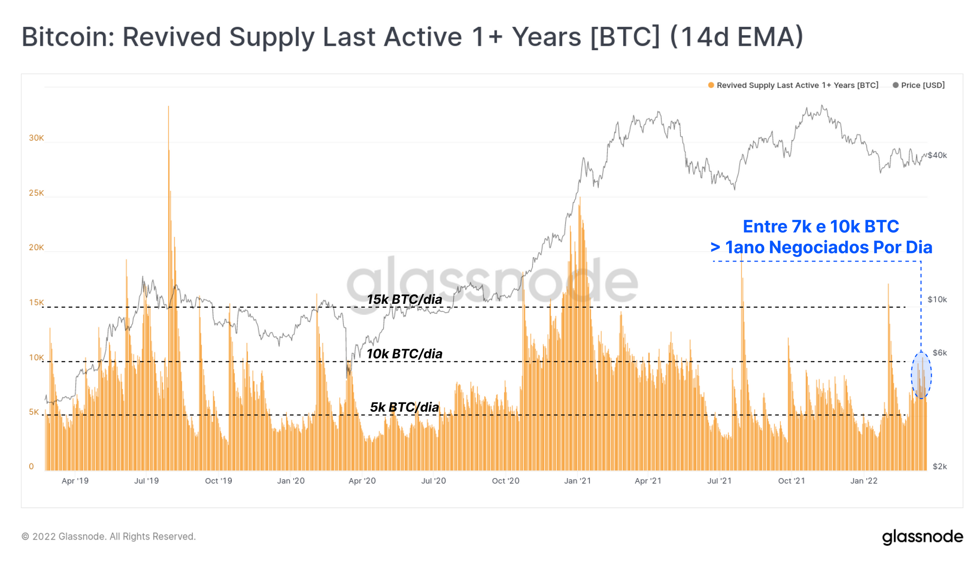 Isso é confirmado olhando para "Revived Supply" >1ano, que demonstra que entre 7k a 10k BTC com >1ano foram gastos por dia nos últimos 30 dias. Há duas interpretações a partir disso:
