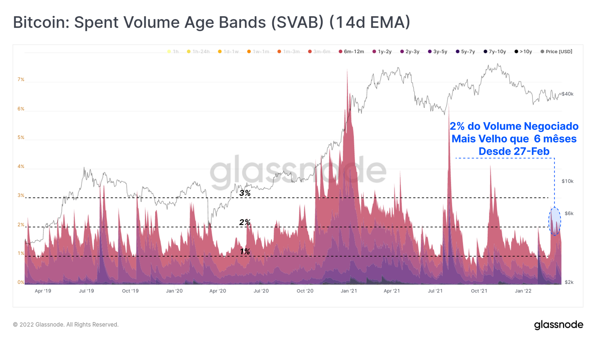Se olharmos para as Faixas Etárias de Volume Gasto (SVAB), podemos ver que uma parte considerável das moedas com mais de 6 meses aumentou seus gastos ao longo de março. Cerca de 2% de todo o volume de transações na cadeia está associado a essas moedas, o que é relativamente significativo.