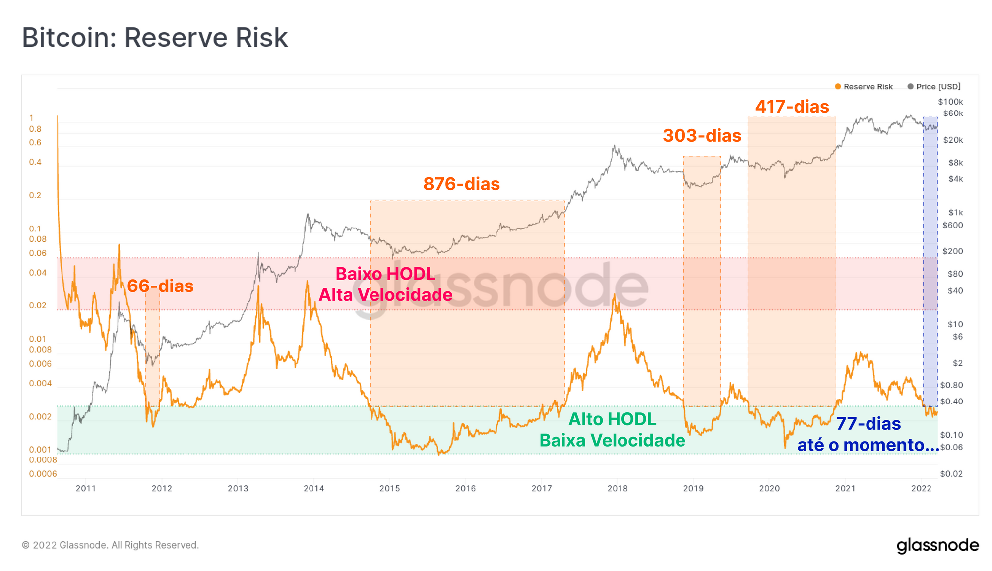 A "Reserv Risk" foi negociada em níveis historicamente subvalorizados por 77 dias até o momento, isso é muito menor do que os períodos plurianuais vistos em 2015-17 e 2018-20. Observe, no entanto, que a "Reserv Risk" geralmente sinaliza bem subvalorização em um mercado touro, pois os HODLers normalmente começam a distribuição somente após um novo preço ATH ser definido (explorado mais aqui).