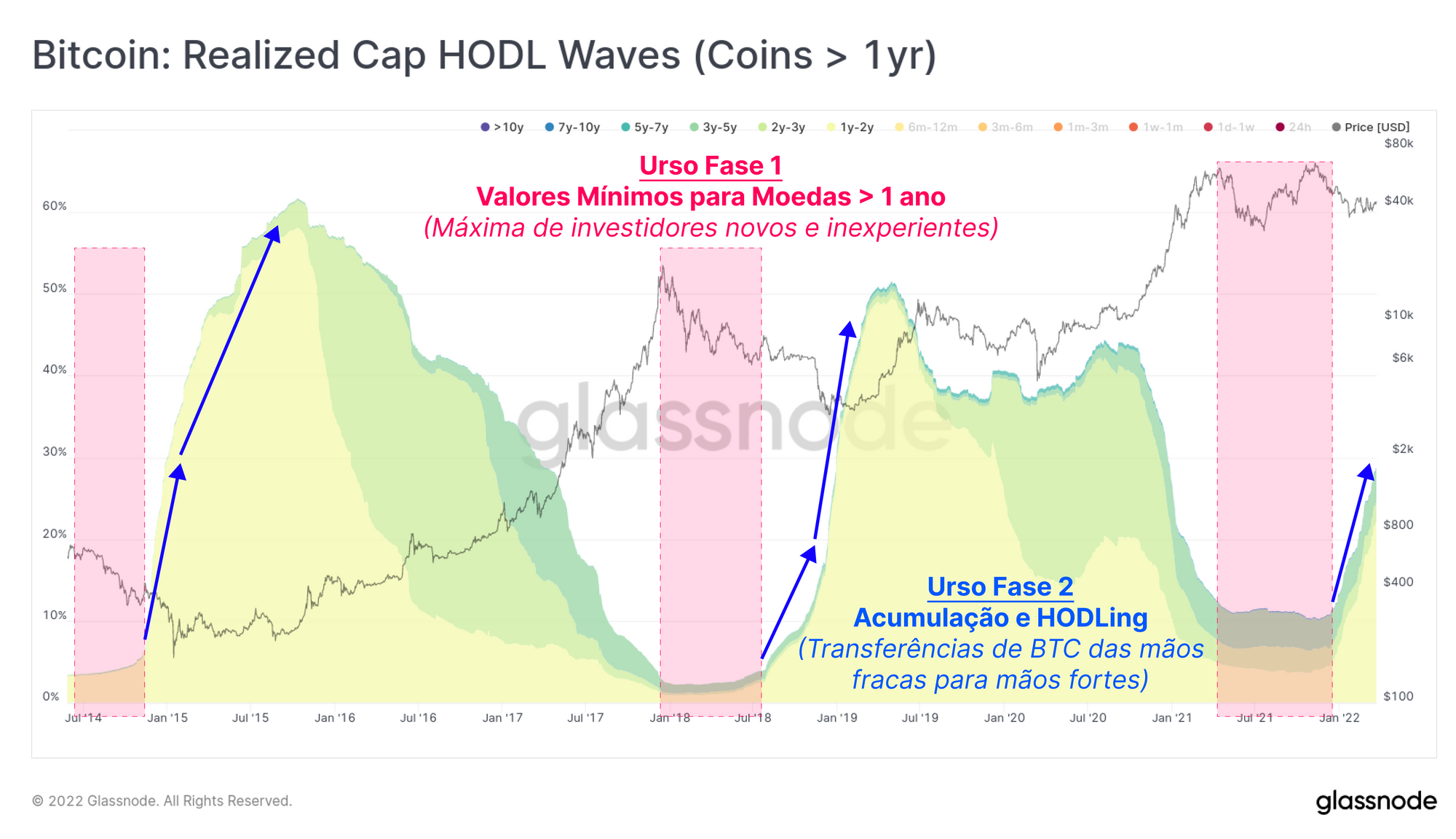 - O segundo e o quarto trimestre de 2021 tem muitas semelhanças com os mercados urso anteriores, onde a riqueza total mantida em moedas de mais de 1 ano atingiu um ciclo mínimo de maio a dezembro de 2021.