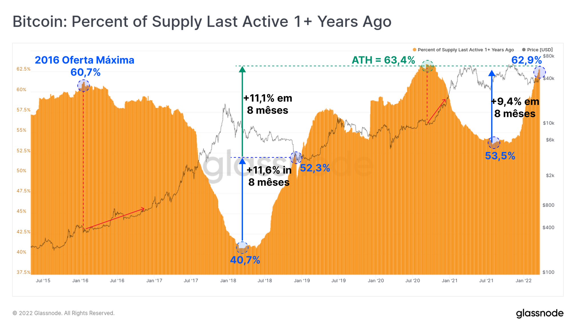 À medida que nos aproximamos do final do primeiro trimestre de 2022, podemos ver um aumento extraordinário na proporção de moedas com mais de 1 ano, que aumentou 9,4% da oferta circulante nos últimos 8 meses. Essas moedas refletem amplamente os volumes de BTC acumulados na fase do primeiro trimestre de 2021 do mercado touro e os proprietários, portanto, suportaram duas quedas de mais de 50% e três máximas históricas de todos os tempos. Essa recuperação é bastante semelhante em escala e duração à recuperação de 2018-19.
