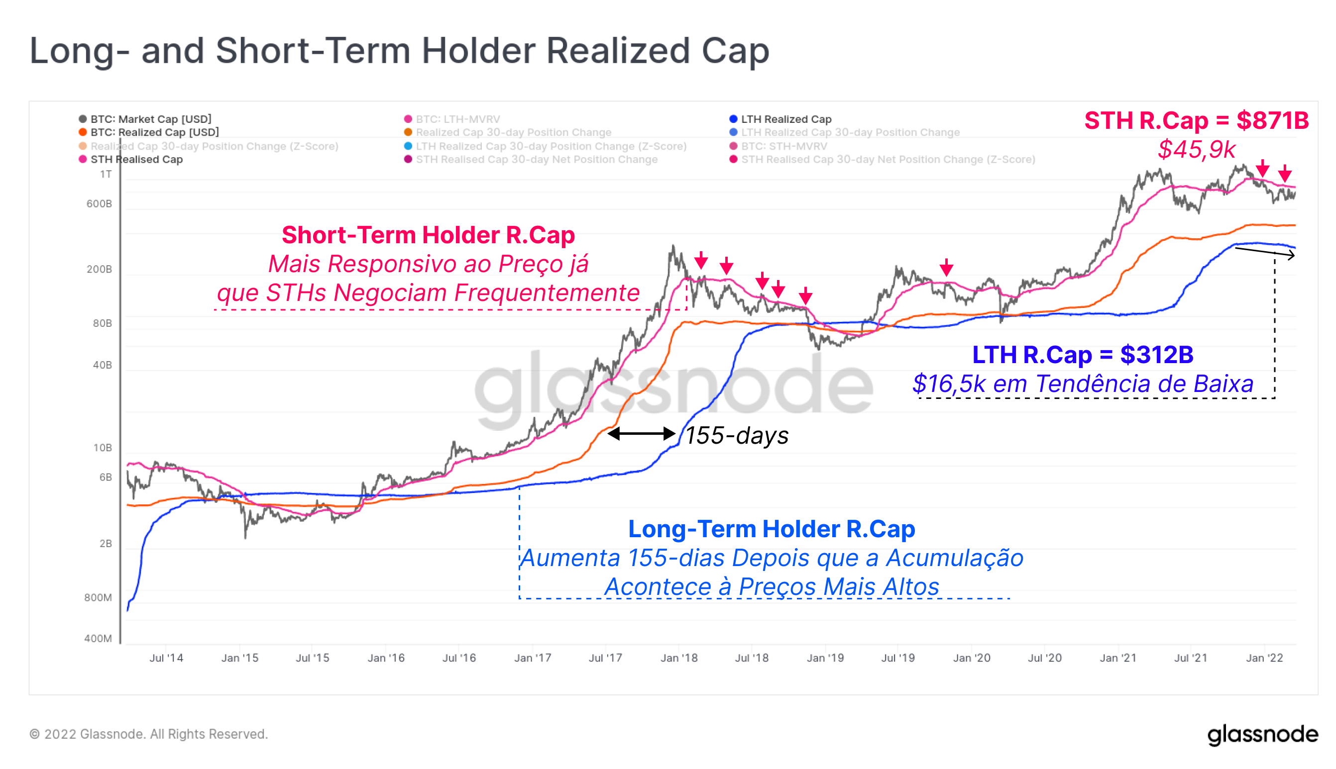 O conceito de 'valor realizado' é capturado inteiramente dentro do "Realized Cap", que reflete a base de custo agregado dos investidores para as grupos de curto e longo prazo. O gráfico abaixo mostra: