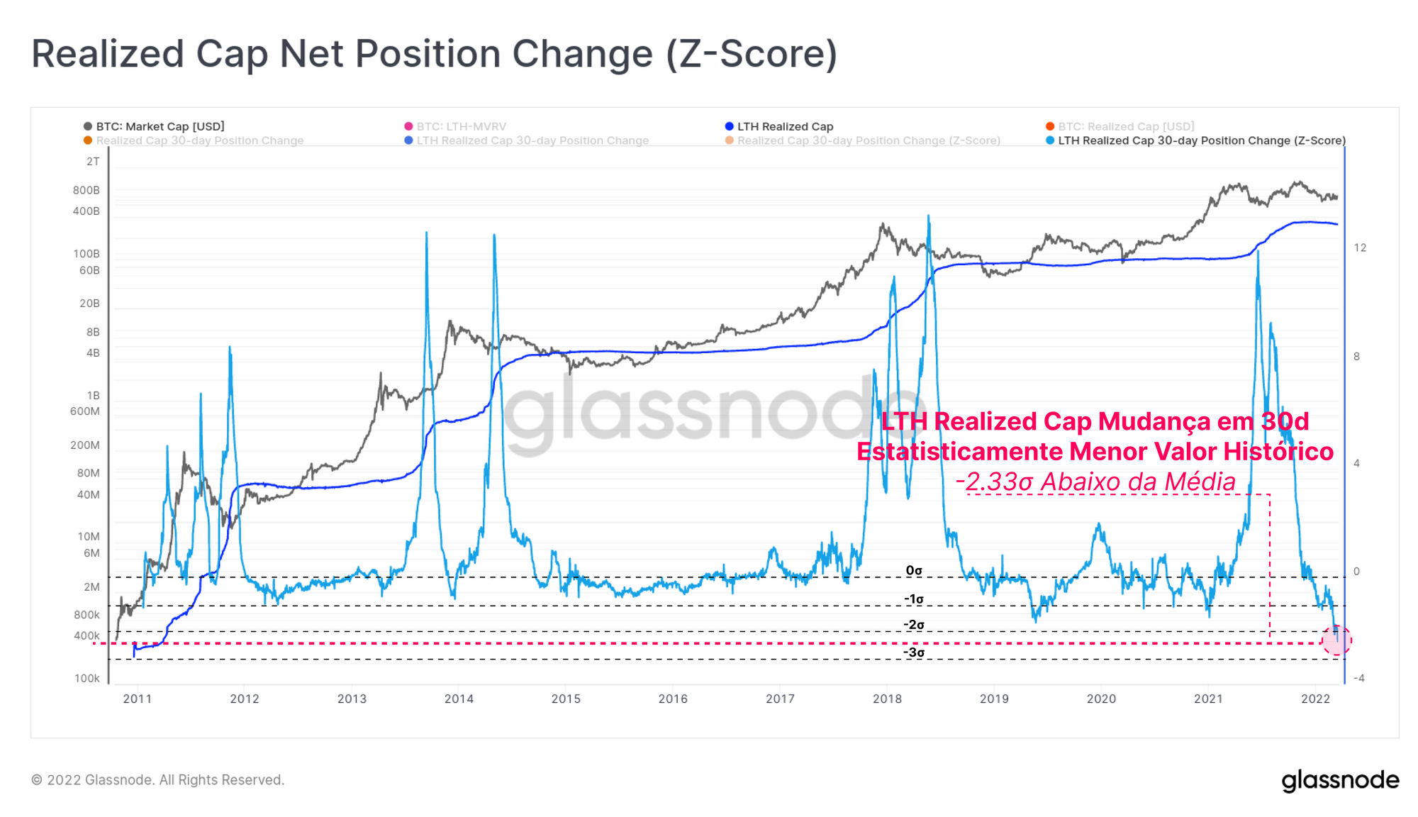 Para finalizar esta observação, apresentamos o "LTH Realized Cap Net Position Change Z-Score". Esta métrica:
