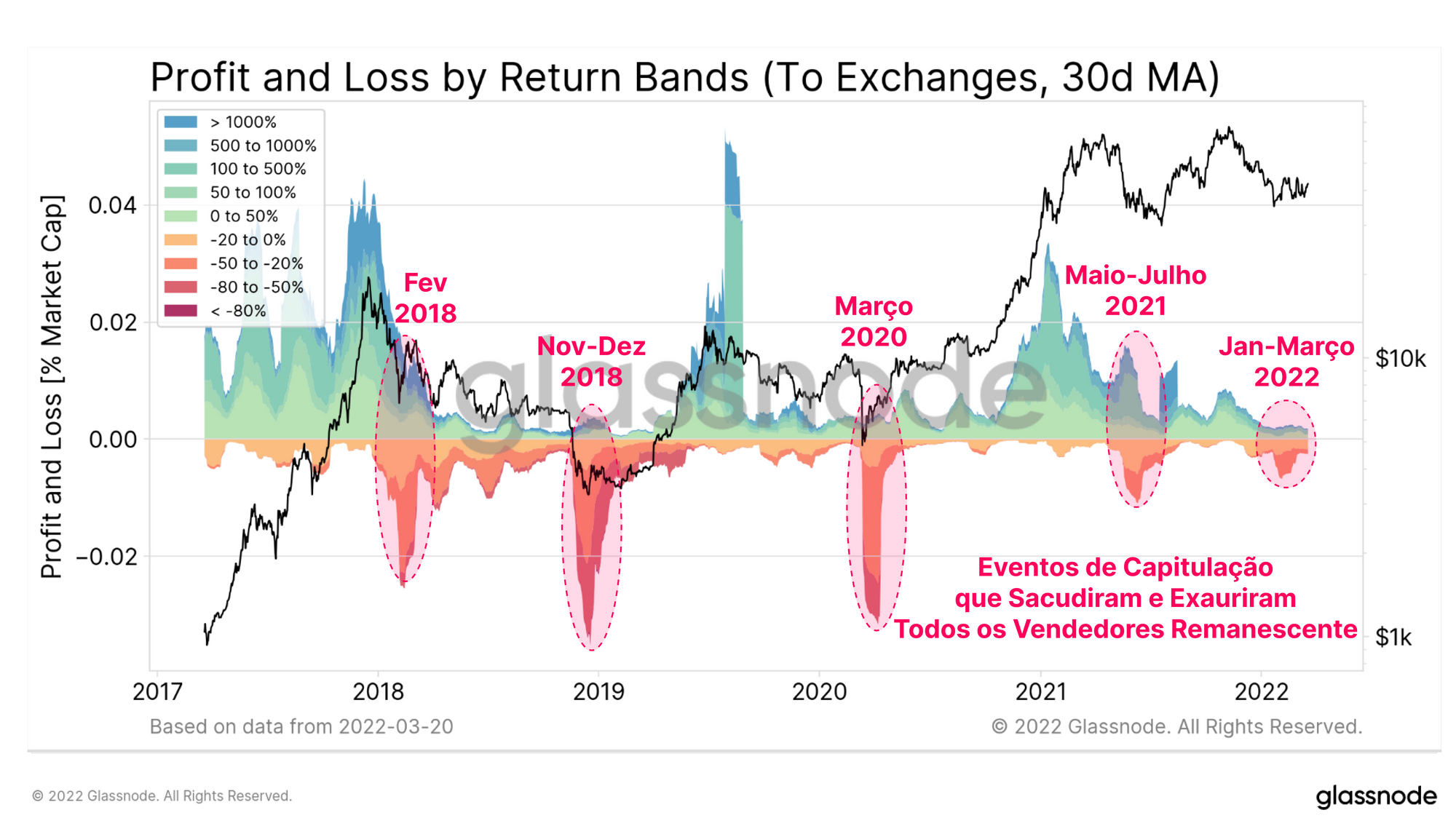 Durante esses eventos, todos os vendedores restantes estão esgotados e normalmente vemos moedas em lucros e moedas em prejuízos sendo vendidas em grande escala. O gráfico abaixo apresenta o grau de lucro/perda realizado em moedas enviadas especificamente para as corretoras (provavelmente para vendas).
