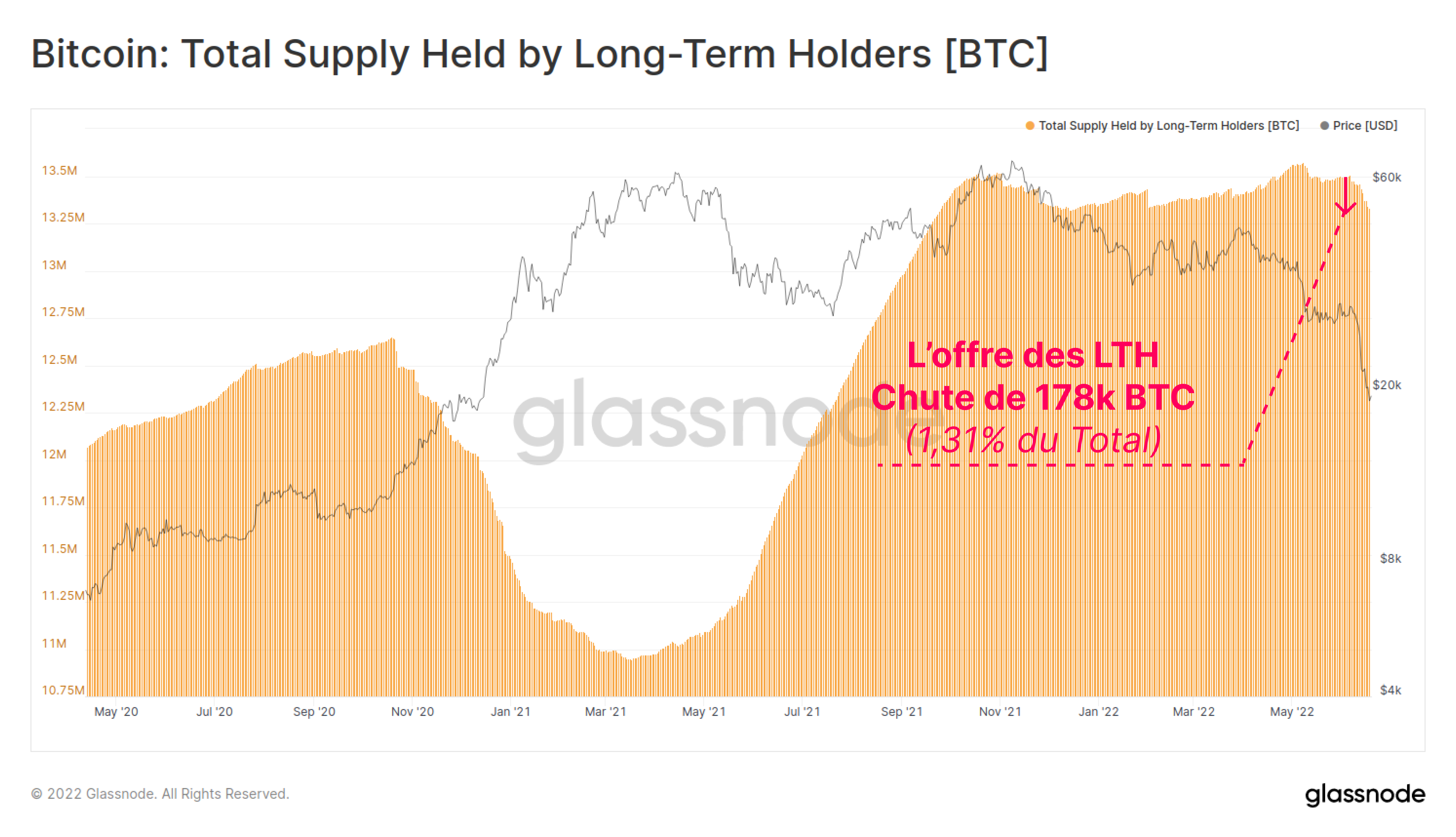 La chute des dominos de l'actuel marché baissier entre dans une nouvelle phase. Aux côtés des mineurs, les détenteurs à long terme commencent maintenant à ressentir la pression, ce qui oblige nombre d'entre eux à vendre à un rythme accéléré. L'offre des détenteurs à long terme a diminué de 178 000 BTC au cours de la semaine dernière, soit l'équivalent de 1,31 % de leurs avoirs totaux.