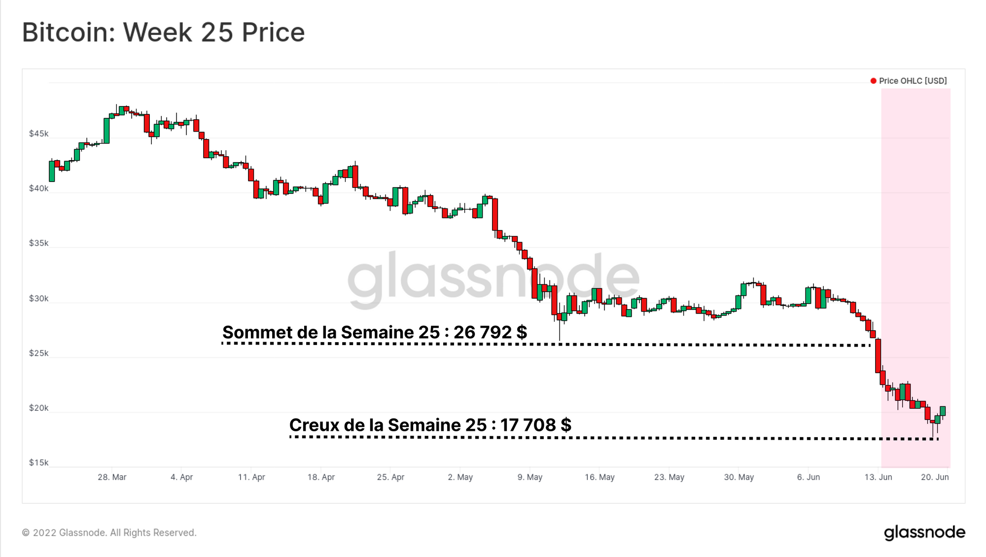 Le marché est passé sous le seuil des 20 000 dollars (ATH de 2017) le dimanche 18 juin, atteignant un plancher remarquable de 17 708 dollars. Le bitcoin et les actifs numériques étant les seuls instruments négociables pendant le week-end, les craintes macroéconomiques et la demande de liquidité en dollars semblent avoir été retirées de ce secteur.