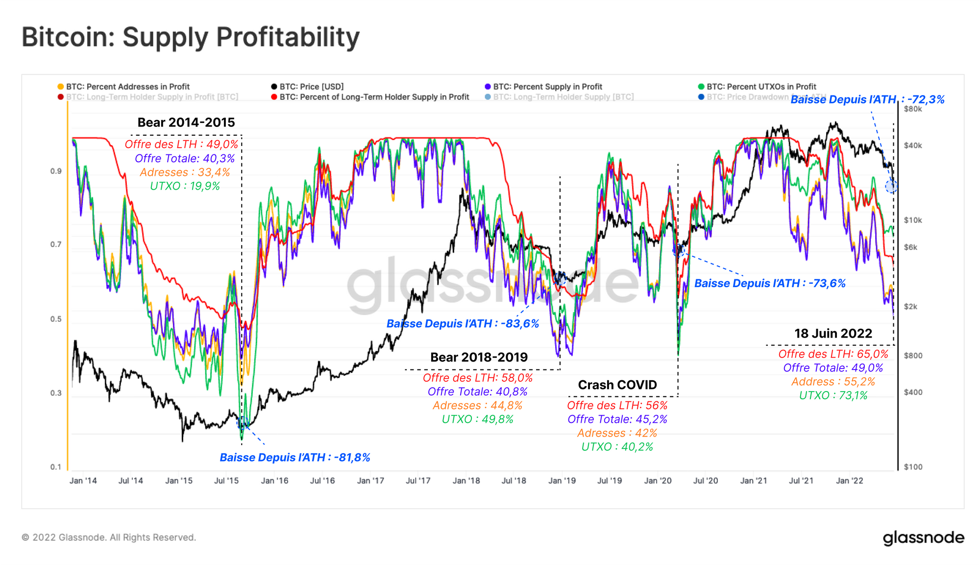 Le marché du BTC a été ébranlé par un événement massif de purge de l'effet de levier, le prix tombant sous le seuil de 20 000 dollars de 2017. Les marchés on-chain de la DeFi et off-chain ont désenflés, les exchanges, les prêteurs et les fonds spéculatifs étant rendus insolvables, illiquides ou liquidés.