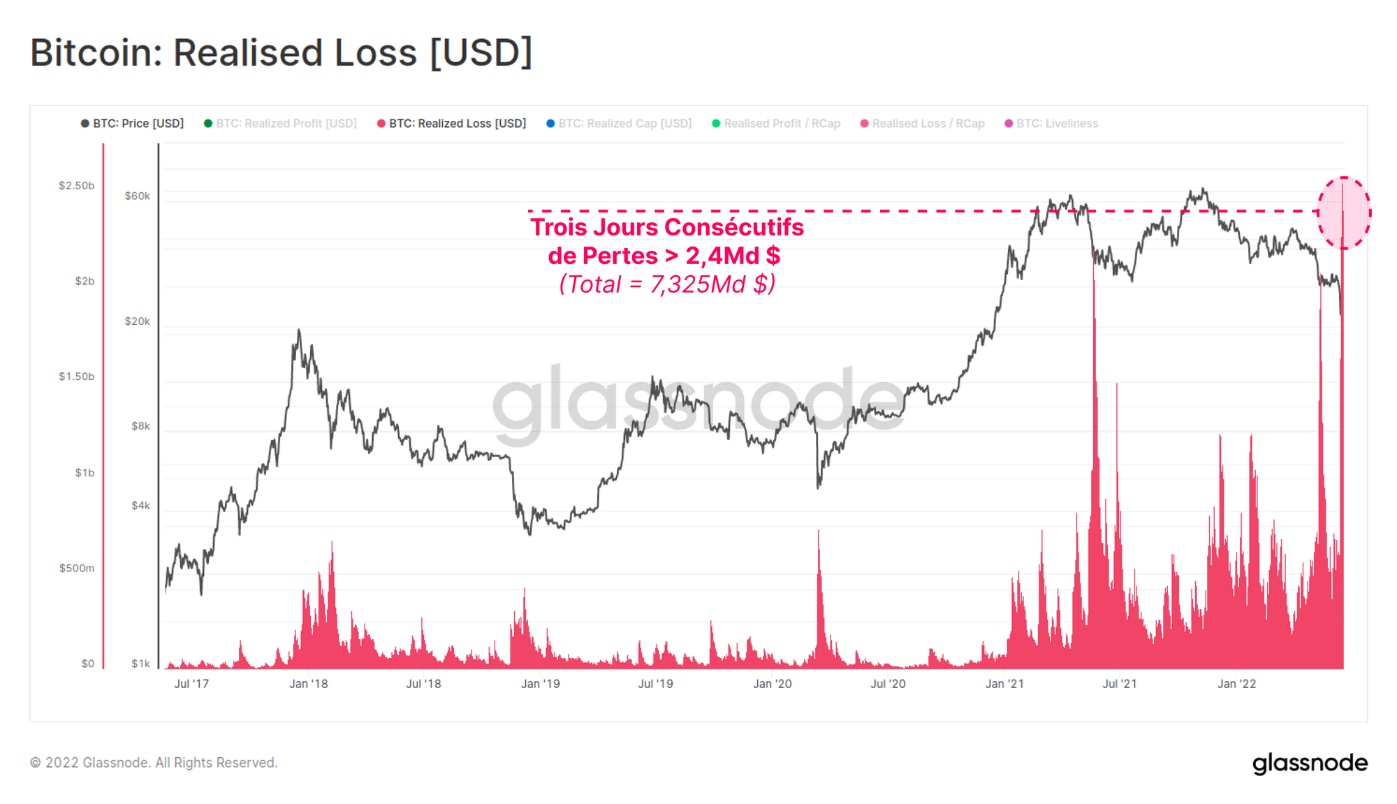 Cette mesure a atteint un nouveau record historique, ponctué par trois jours consécutifs où les pertes réalisées à l'échelle du marché ont dépassé 2,4 milliards de dollars par jour, pour un total de 7,325 milliards de dollars. Le stress de rentabilité mentionné ci-dessus semble se traduire par ces pertes réalisées par les investisseurs.