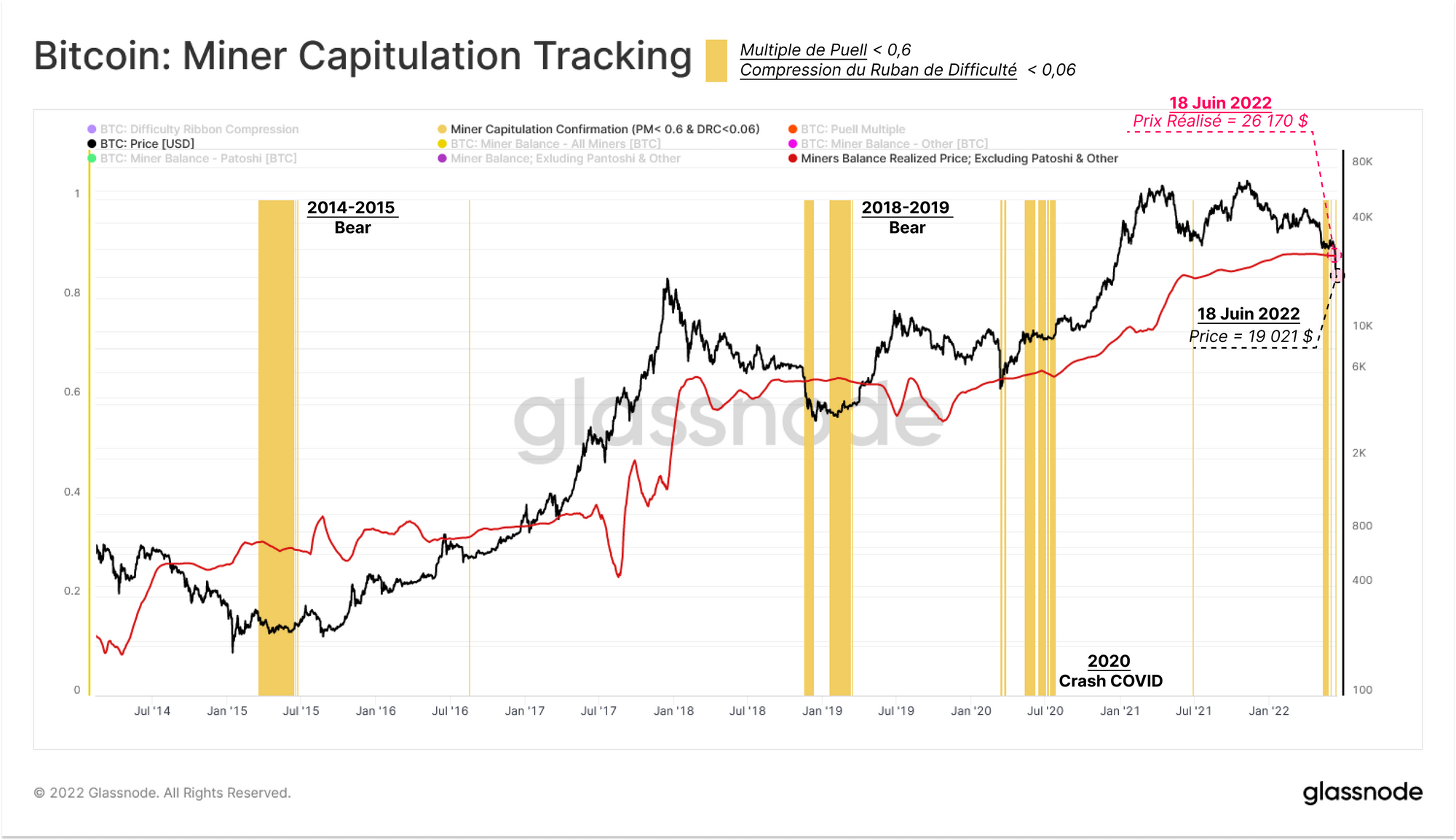 Sur la base de ces deux modèles, la contraction actuelle des revenus des mineurs est pire que lor de la grande migration de mai-juillet 2021. Toutefois, les mineurs ont connu des pires augures en 2018-2019 et en 2014-2015, lors des marchés baissiers, où le multiple de Puell a atteint 0,31 (baisse de 69 % des revenus par rapport à la moyenne annuelle).