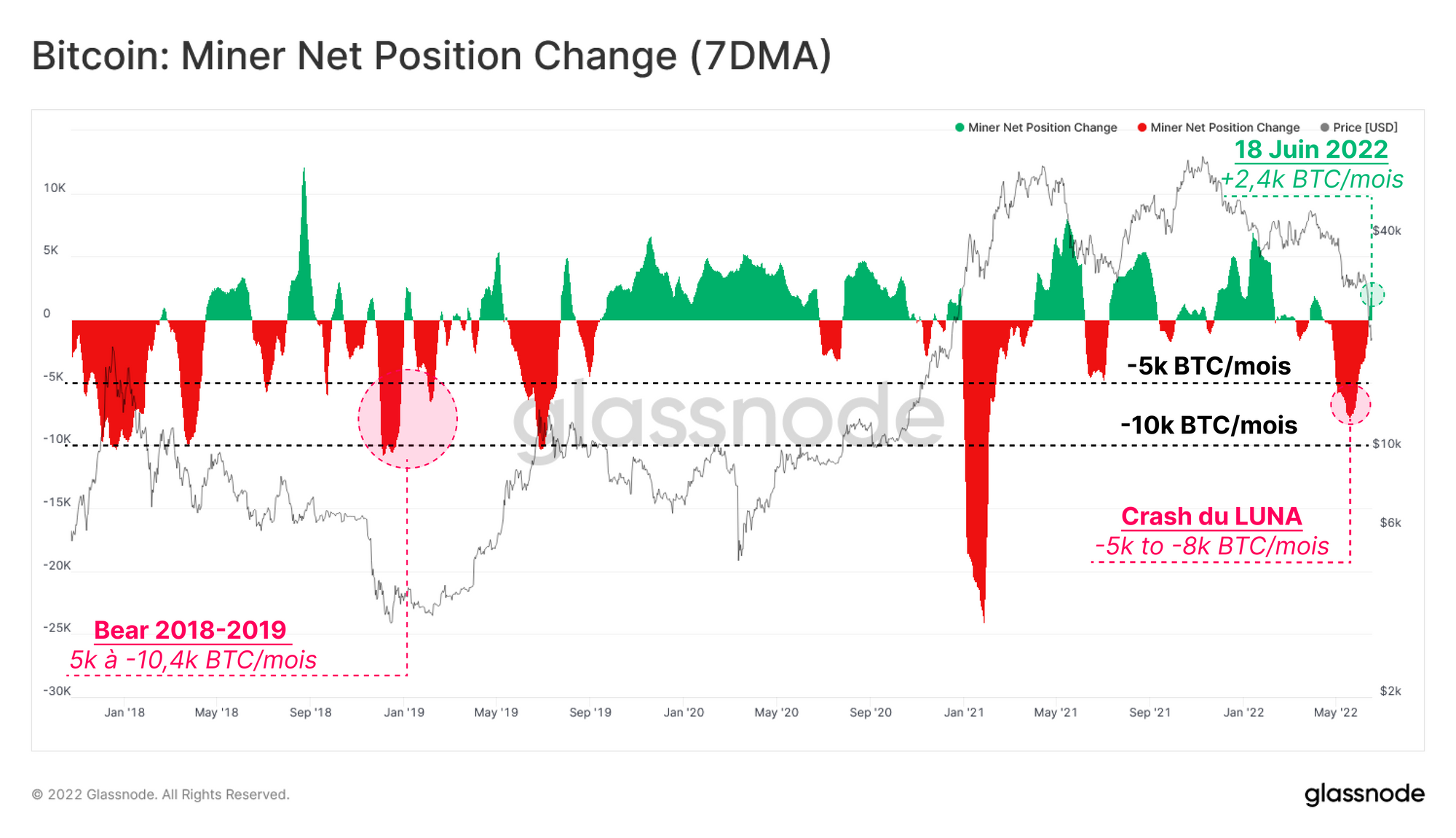 Notre enquête de la semaine 23 a mis en évidence la pression exercée sur les revenus des mineurs en raison de la baisse de leurs revenus et de la hausse des coûts de production. Les comportements des mineurs confirment maintenant qu'une phase de capitulation de cette cohorte est en cours.