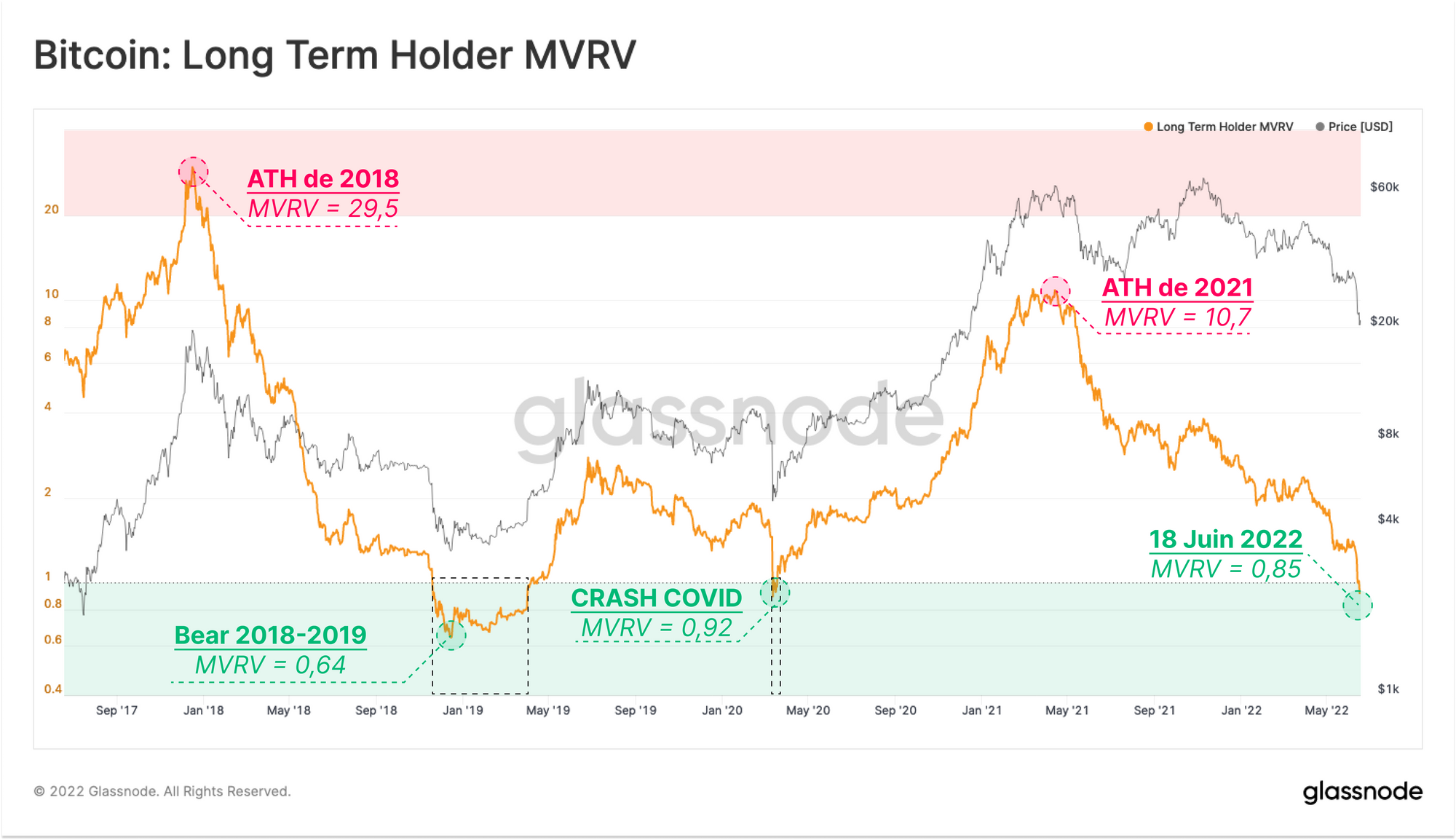 Nous pouvons cartographier le stress financier qui motive les détenteurs à long terme en utilisant LTH-MVRV, un ratio entre le prix du marché et le prix réalisé par LTH. Le récent effondrement du marché à 17,6k $ a poussé cette mesure à 0,85, ce qui signifie que les LTH, en moyenne, détiennent une perte non réalisée de 15%. Il s'agit d'un plus bas plus profond que celui établi lors du crash du COVID et juste un peu au-dessus du bas de capitulation du marché baissier 2018-2019.