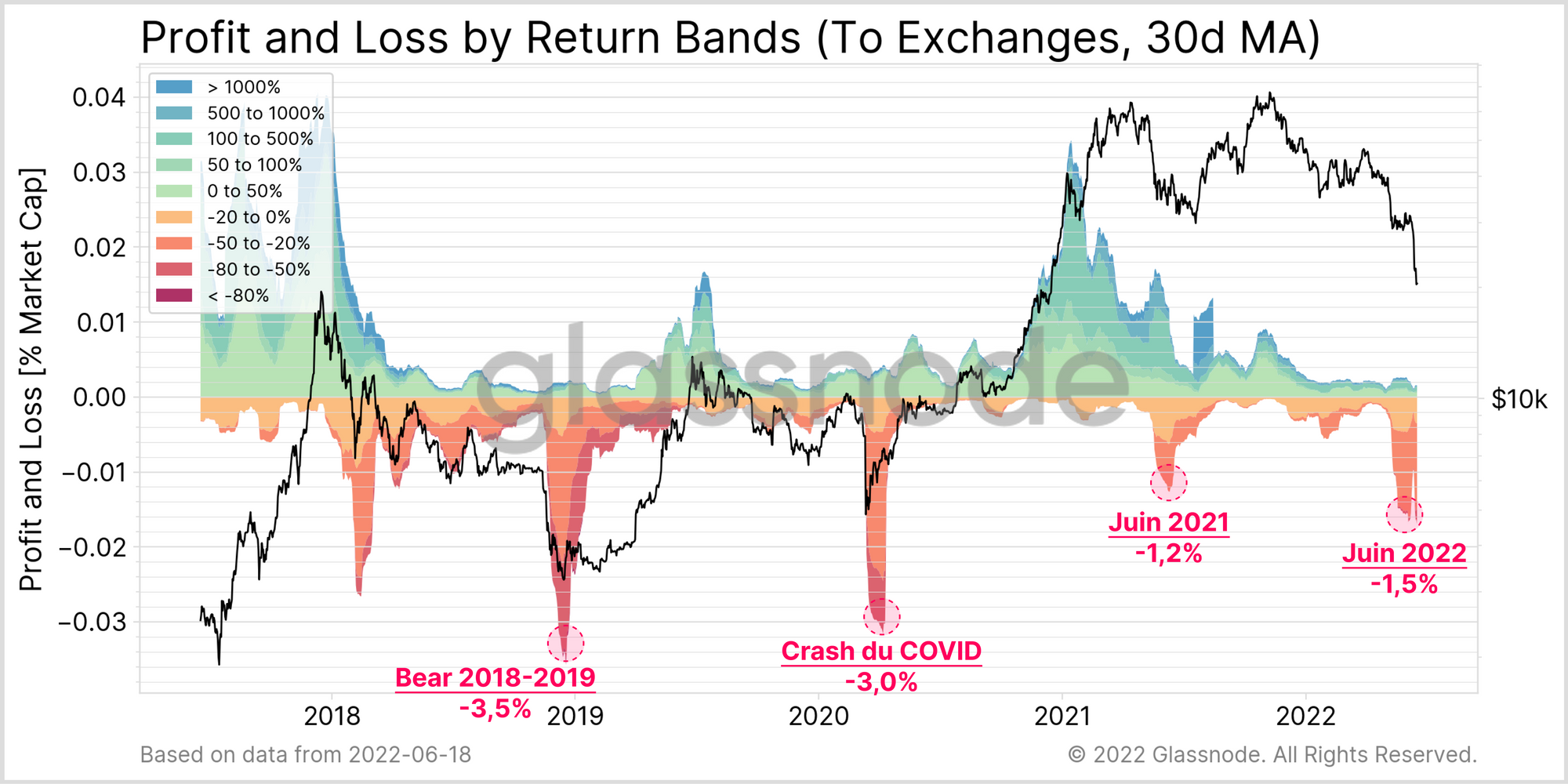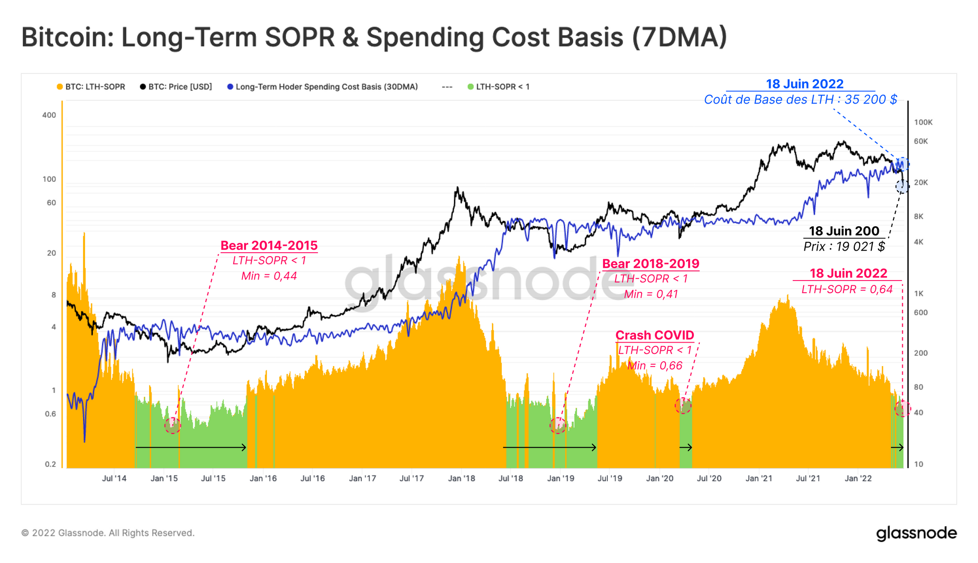 Ainsi, le comportement actuel de dépenses des LTH qui subissent des pertes coïncide avec mars 2020, mais n'est pas aussi sévère que les creux du marché baissier de 2015 ou 2018.