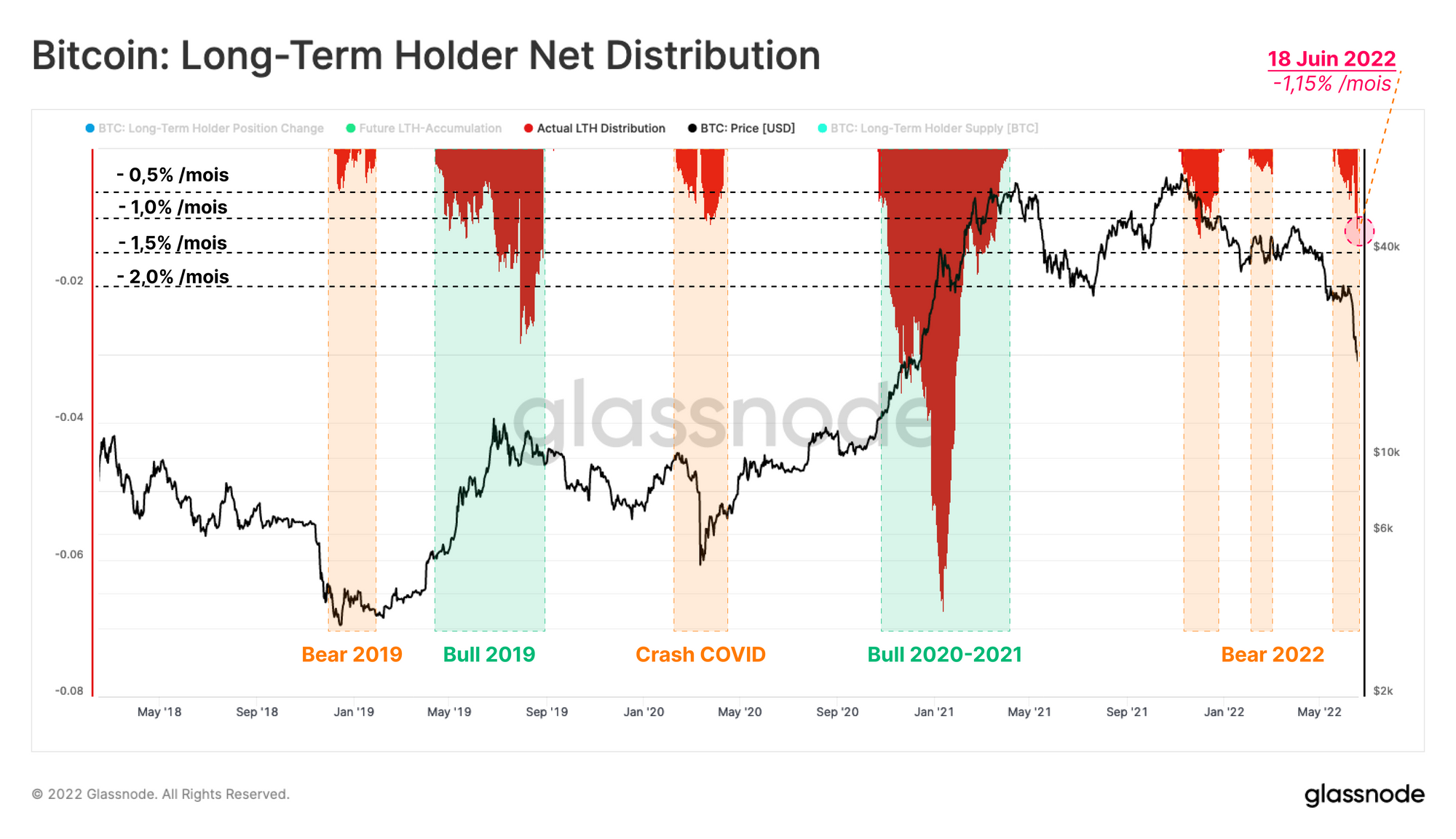 Au cours de la récente chute, les LTH ont dépensé un peu plus de 1 % de leur offre par mois, un taux qui coïncide avec le crash COVID et la correction post-ATH de décembre 2021. Ce niveau est presque deux fois plus élevé que la sortie maximale du marché baissier 2018-2019.