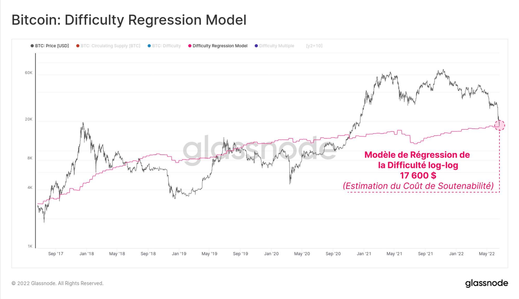 Il est tout à fait possible de considérer le bitcoin comme un bien numérique, et comme beaucoup de biens, il a tendance à avoir une relation avec son coût de production. En exécutant un modèle de régression log-log entre la difficulté et la capitalisation boursière du BTC, nous pouvons estimer un coût global des BTC extraits.
