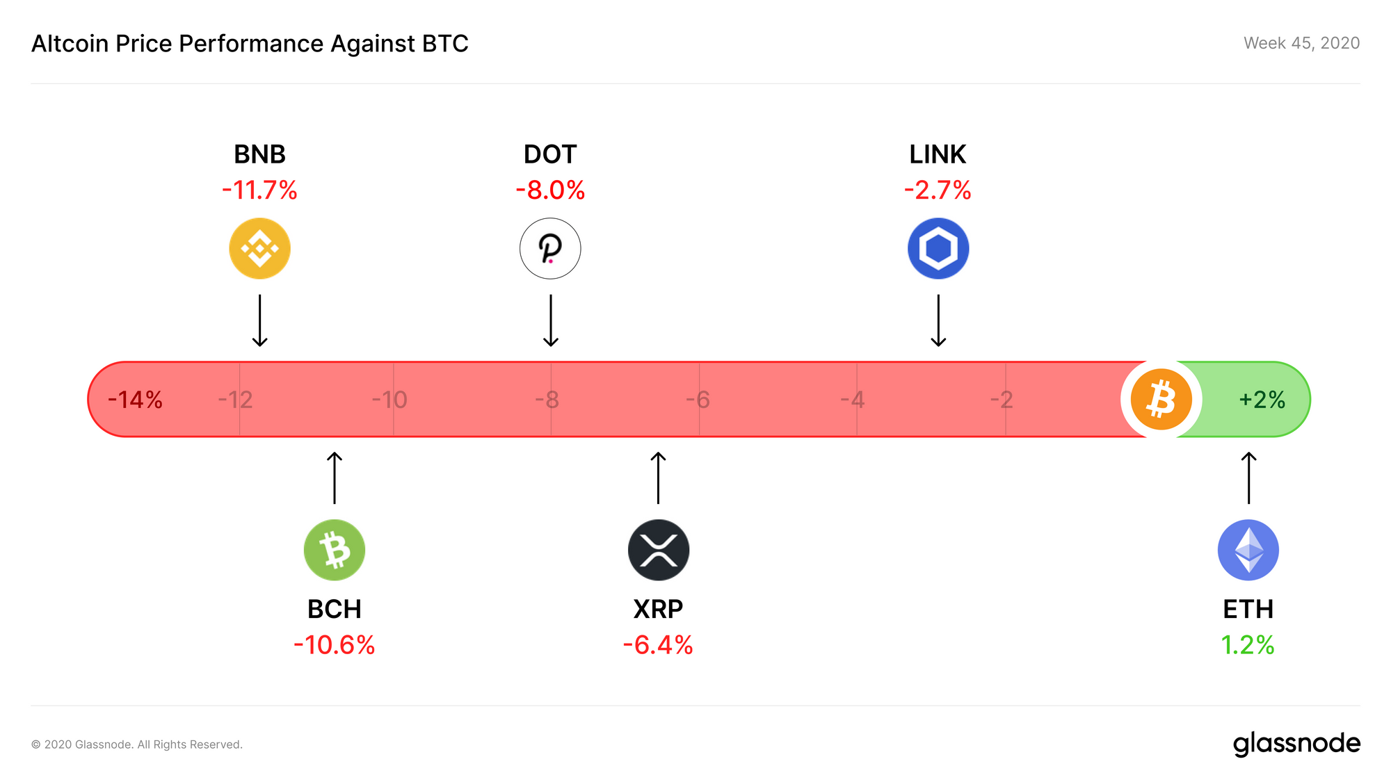 大多数主流山寨币在第45周的表现都比比特币差,相对与比特币,它们的价值下降幅度在-2.7%到-11.7%之间。但是ETH是一个明显的例外,本周兑换比特币的汇率上涨了1.2%。