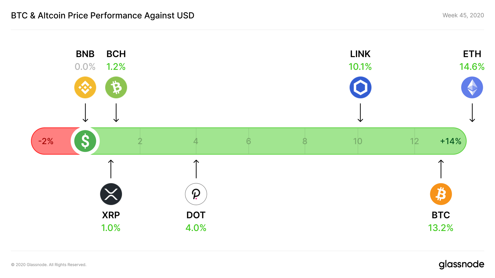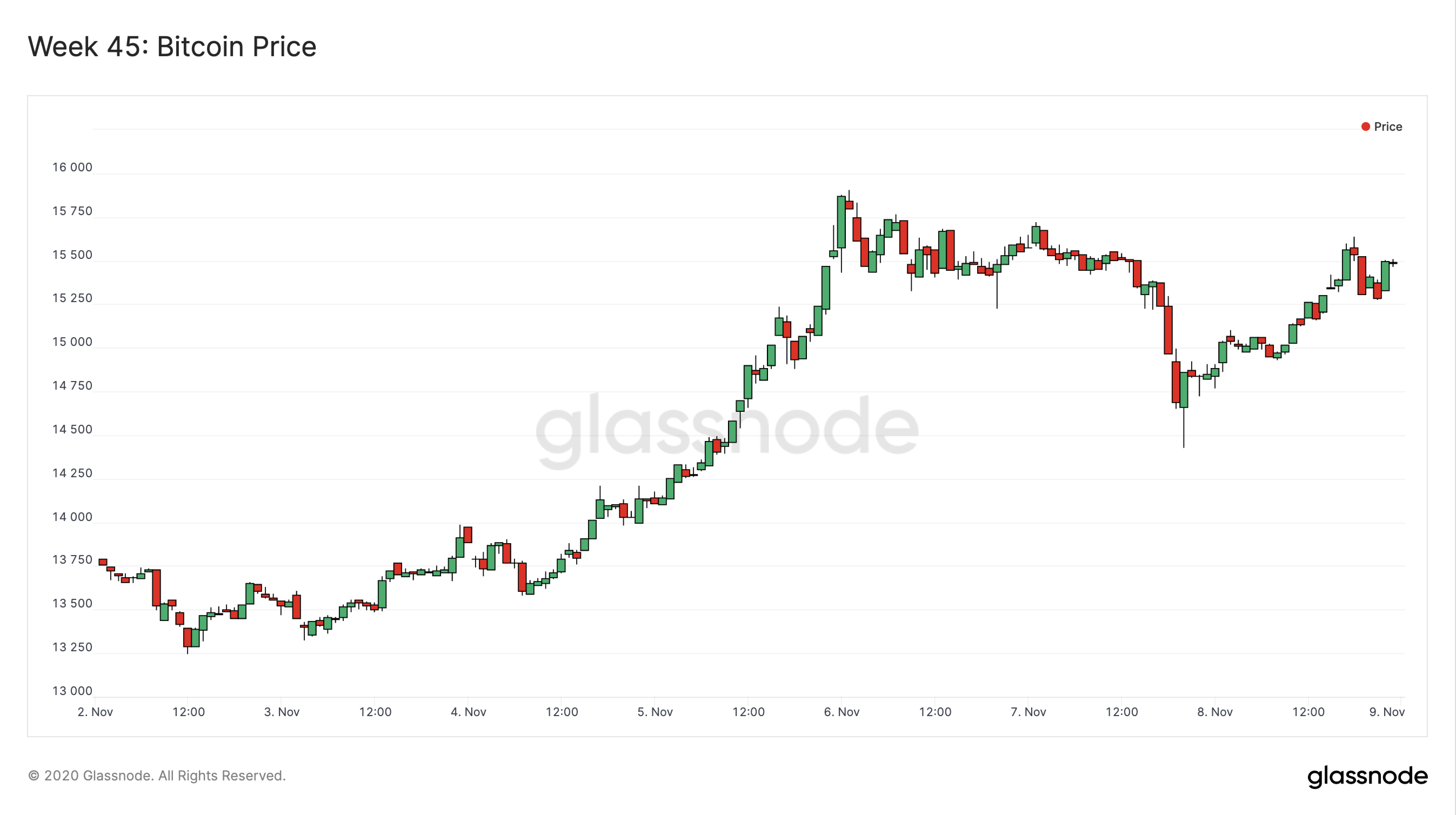 比特币在本周又展现了骄人的表现,第45周开始时比特币的价格为13690美元,结束时的价格为15500美元。这相当于13.2%的增长,自2018年1月以来比特币首次超过1.5万美元,上一次站在此位置已经过去了将近3年。