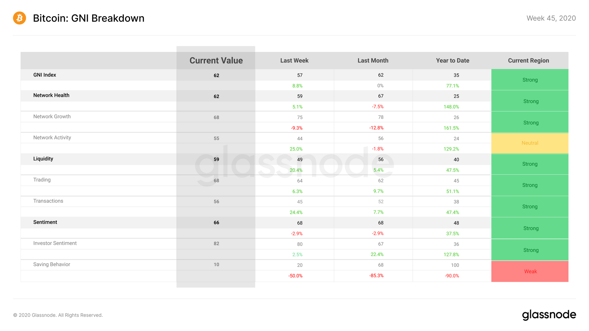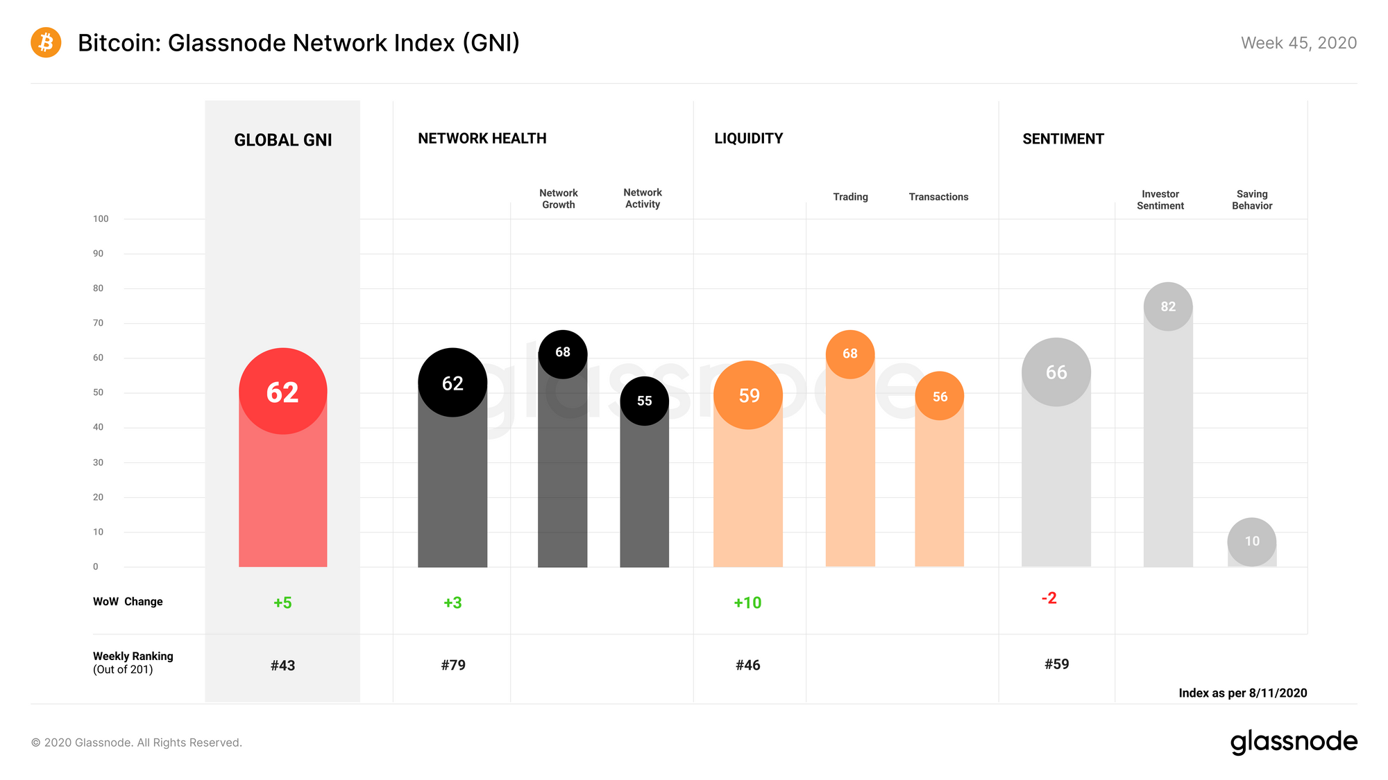 第45周,比特币链上基本面小幅上涨,开始弥补前一周的损失。Glassnode网络指标GNI上涨5分,达到62分。这一涨幅主要是由流动性子指数的驱动,网络健康指数也获得了一定的上涨。