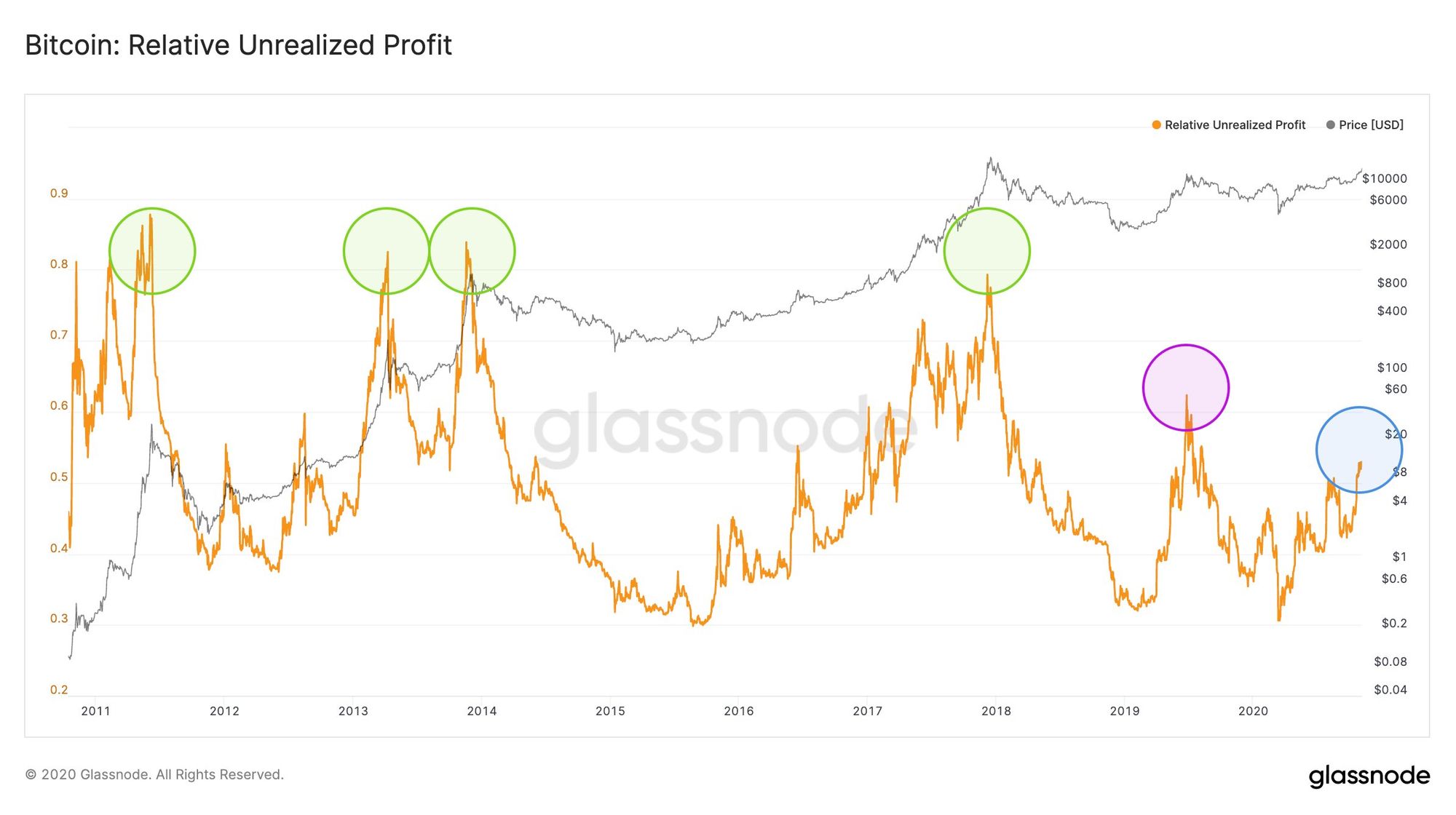 比特币的相对未实现利润是指所有现存比特币的总利润,计算公式为:在变现时的价格(即最后一次移动时)低于当前价格的比特币的当前总利润,并按市值标准化。