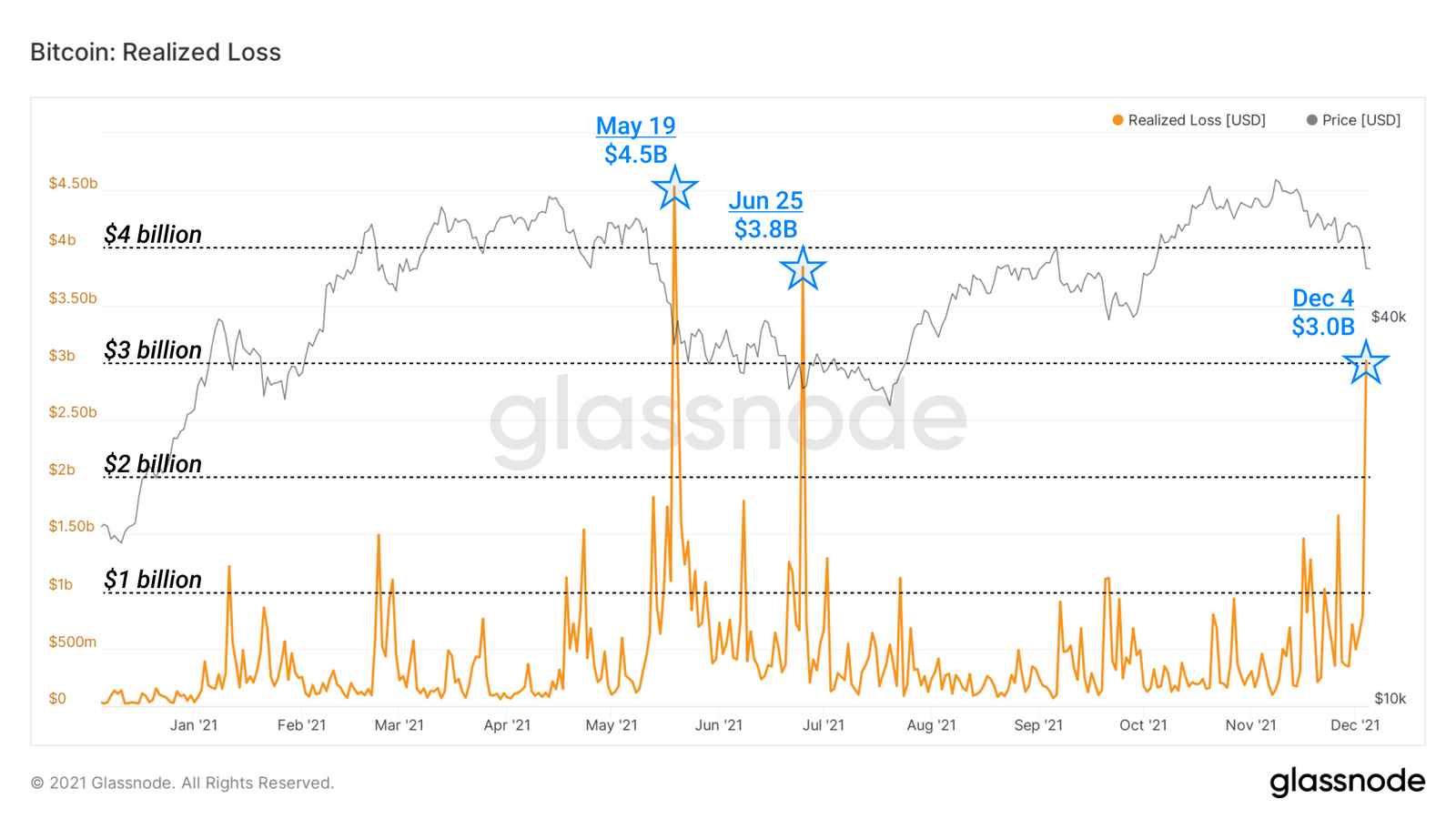 随着期货的连环爆仓,卖出者也在损失,上周的事件创造了近期链上已实现损失的高点。12月4日卖出的并处于损失的币的总值为30亿美元。上周六,如果按5月19日和6月25日创造的历史前高计算,损失分别为45亿美元和38亿美元。