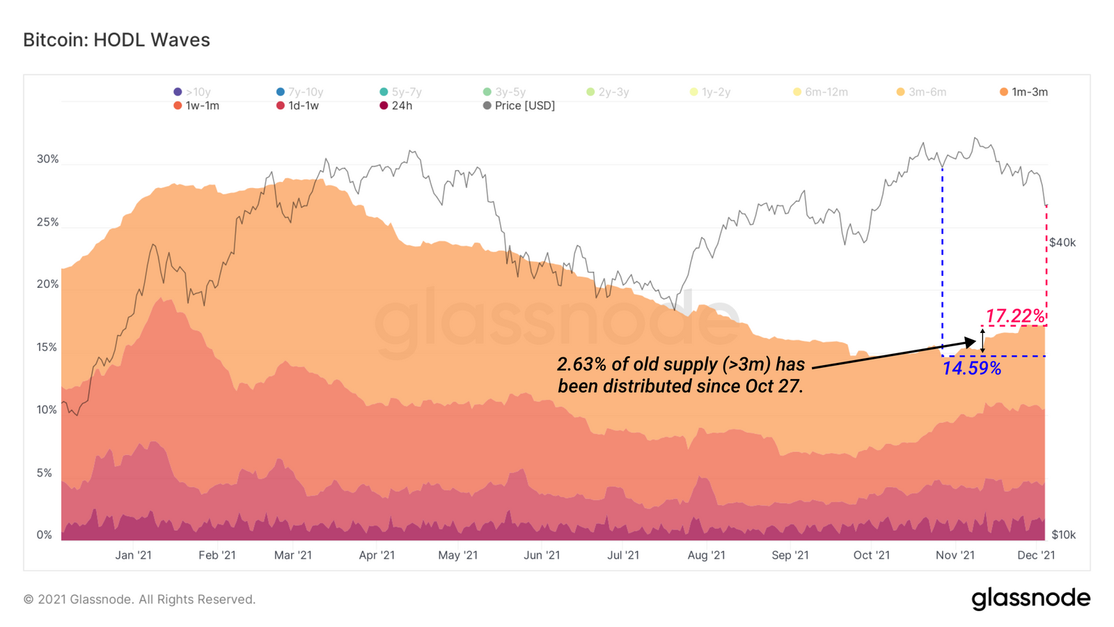 当过滤显示小于3个月的比特币时,我们看到自10月27日以来,只有2.63%的较旧的比特币供应分布在这一组中。这意味着自最近的历史高点和回调以来,超过97%的3个月以上的供应量仍然没有被卖出。总的来说,币龄较老的的囤币党并没有卖出币。