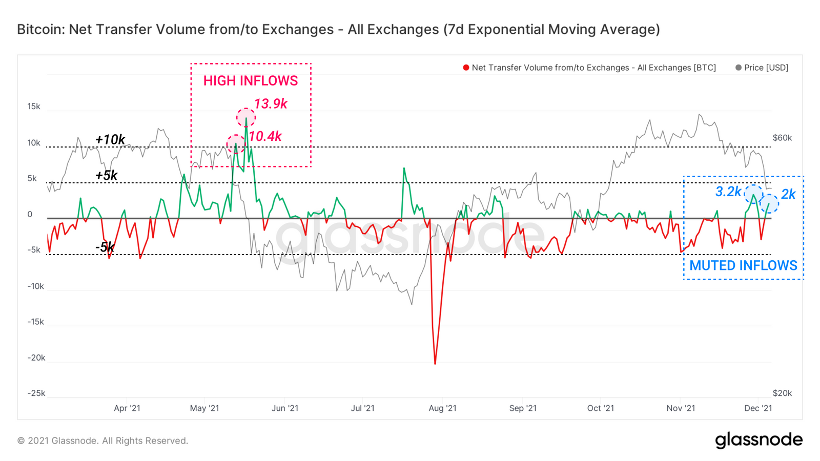 • 当这个值很高或上升时,交易所在链上产生高的结算活动,如在2020年末和2021年春季的牛市期间的情况。